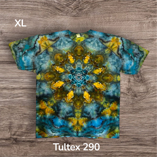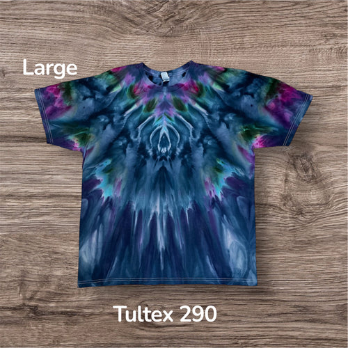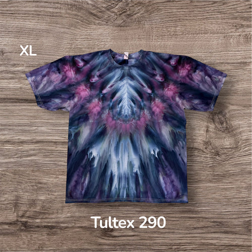 Some of my pieces are reversed dyed, meaning that I start off with a black or any other colored shirt. I tie up the design and it goes through a bleaching process or discharge of the color. After carefully rinsing, washing and drying the piece I go back in with my regular ice dyeing process.