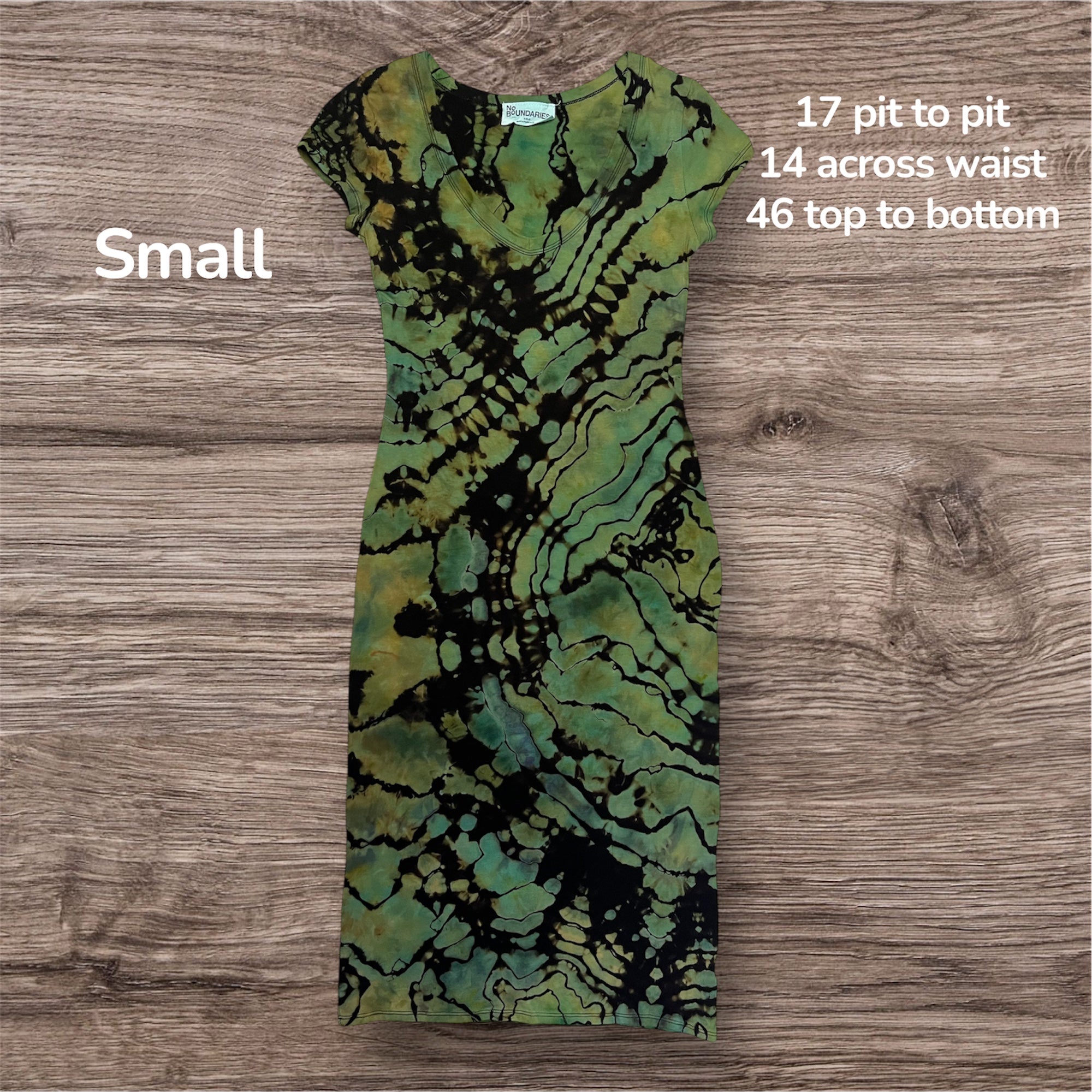 Hand tied, reverse dyed and hand ice dyed geode design on a stretchy 100% cotton, No Boundaries Vneck dress. This one measures 17 inches pit to pit, 14 across the waist and 46 from top to bottom.