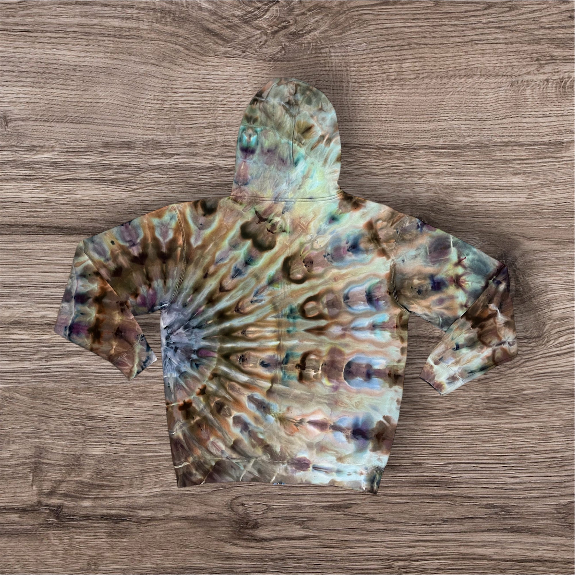 Hand tied and hand ice dyed sunburst design on a Unisex independent trading, Midweight, zipper, hooded sweatshirt. These sweatshirts are 80/20 cotton/poly. This one measures 23 inches pit to pit and 29 inches from top of shoulder to bottom.