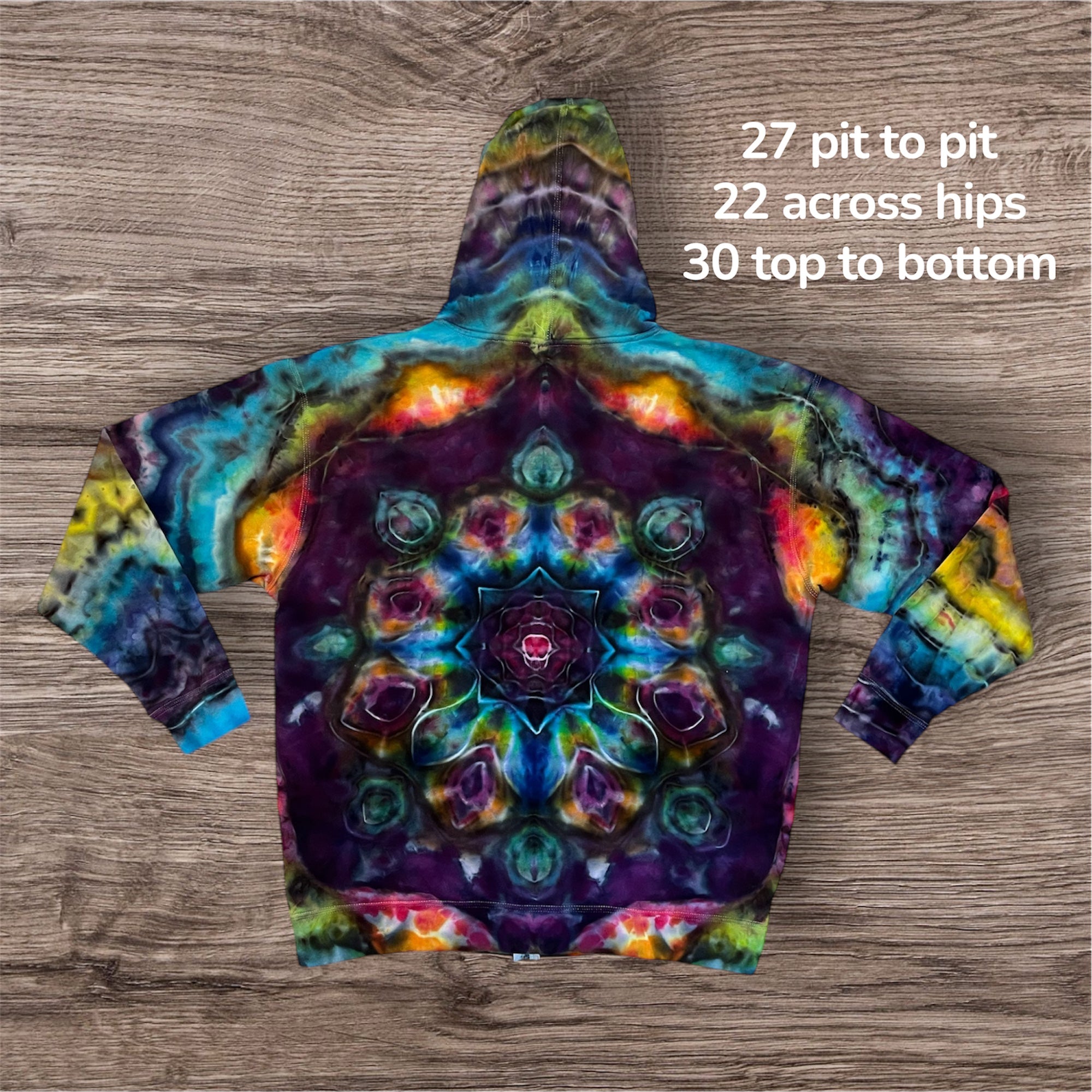 Hand tied and hand ice dyed moon and mandala design on a Unisex independent trading, Midweight, zipper, hooded sweatshirt. These sweatshirts are 80/20 cotton/poly. This one measures 25 inches pit to pit and 30 inches from top of shoulder to bottom.