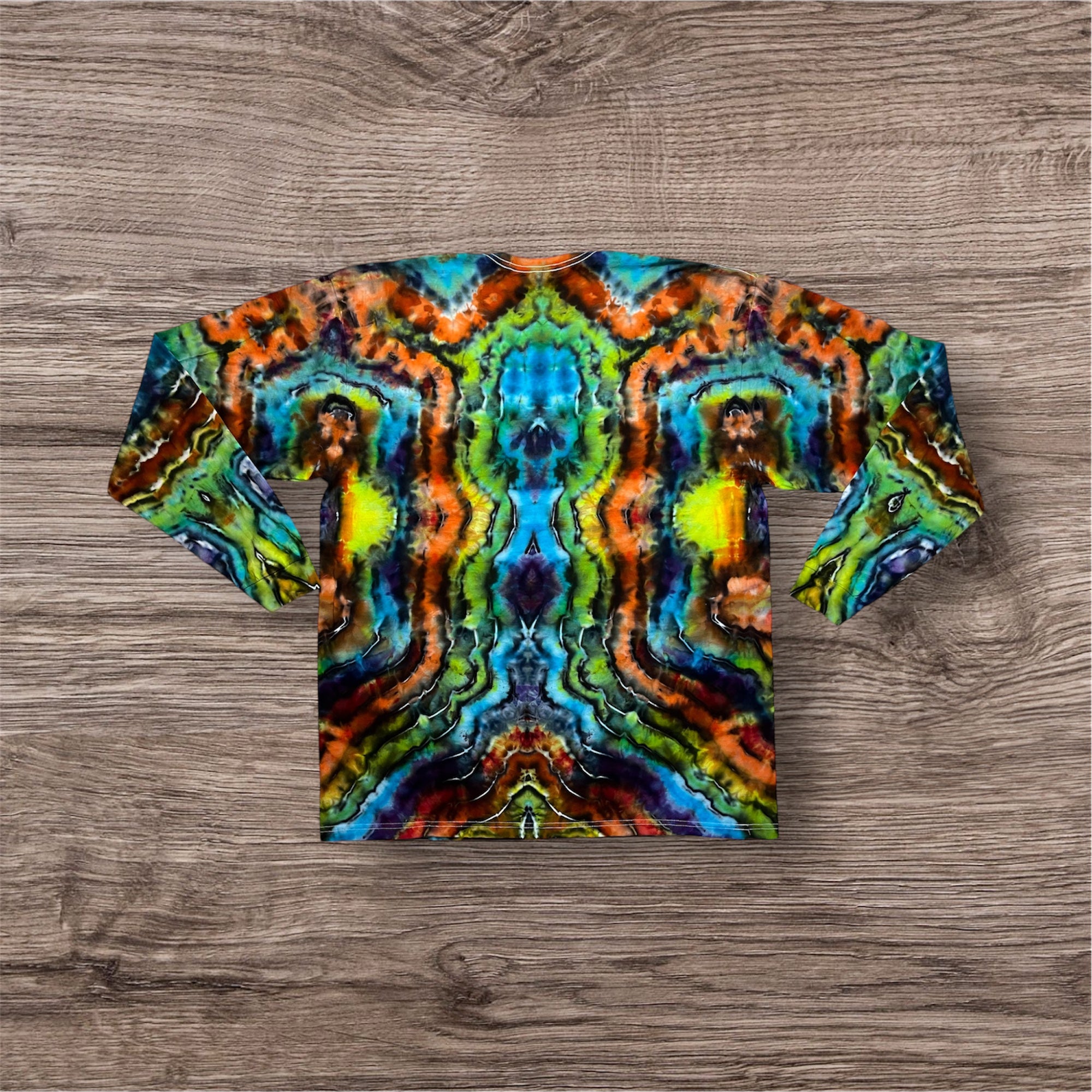 Hand tied, then hand ice dyed design on a unisex Tultex 291 long sleeve Tshirt. This one measures 27 pit to pit and 34 inches from top to bottom.