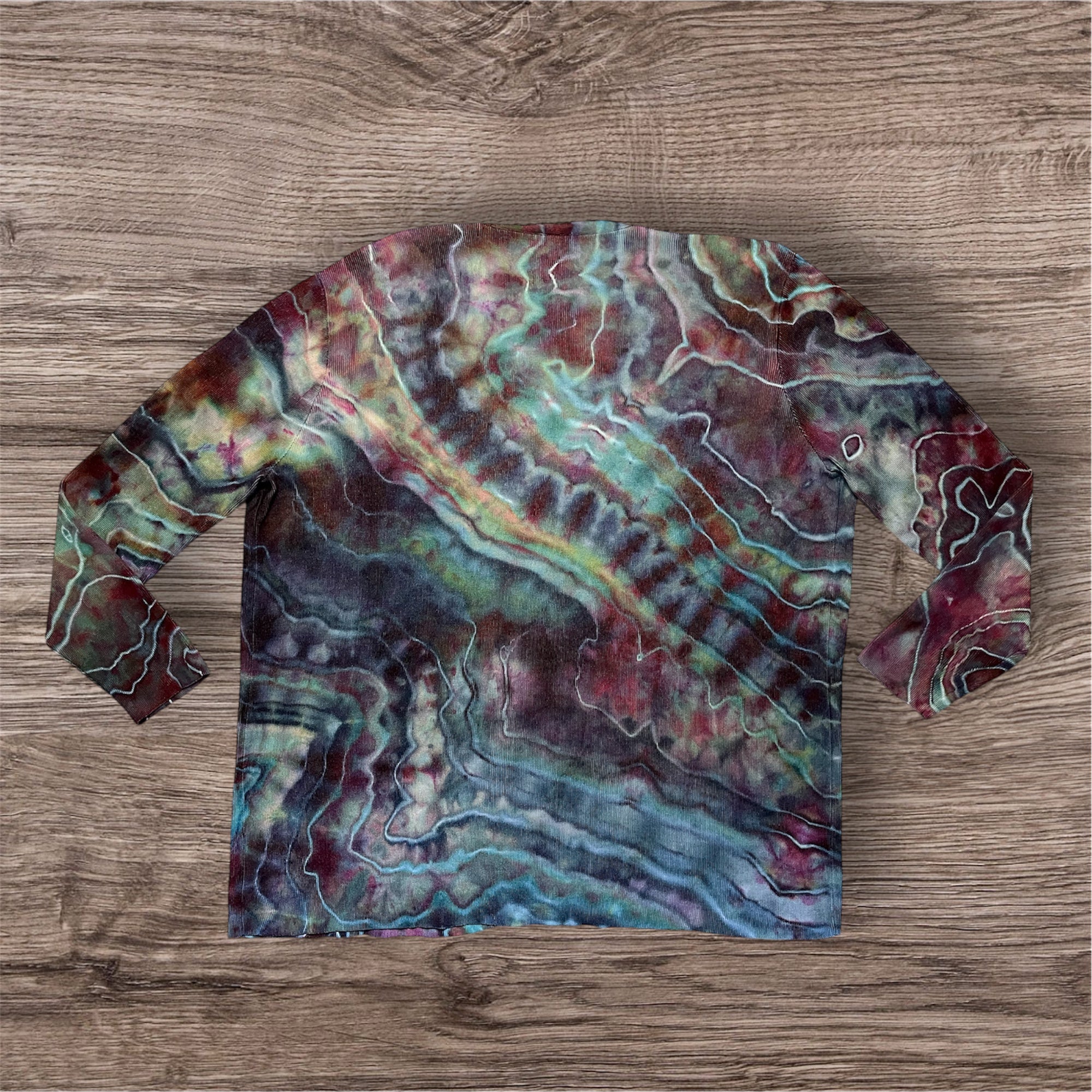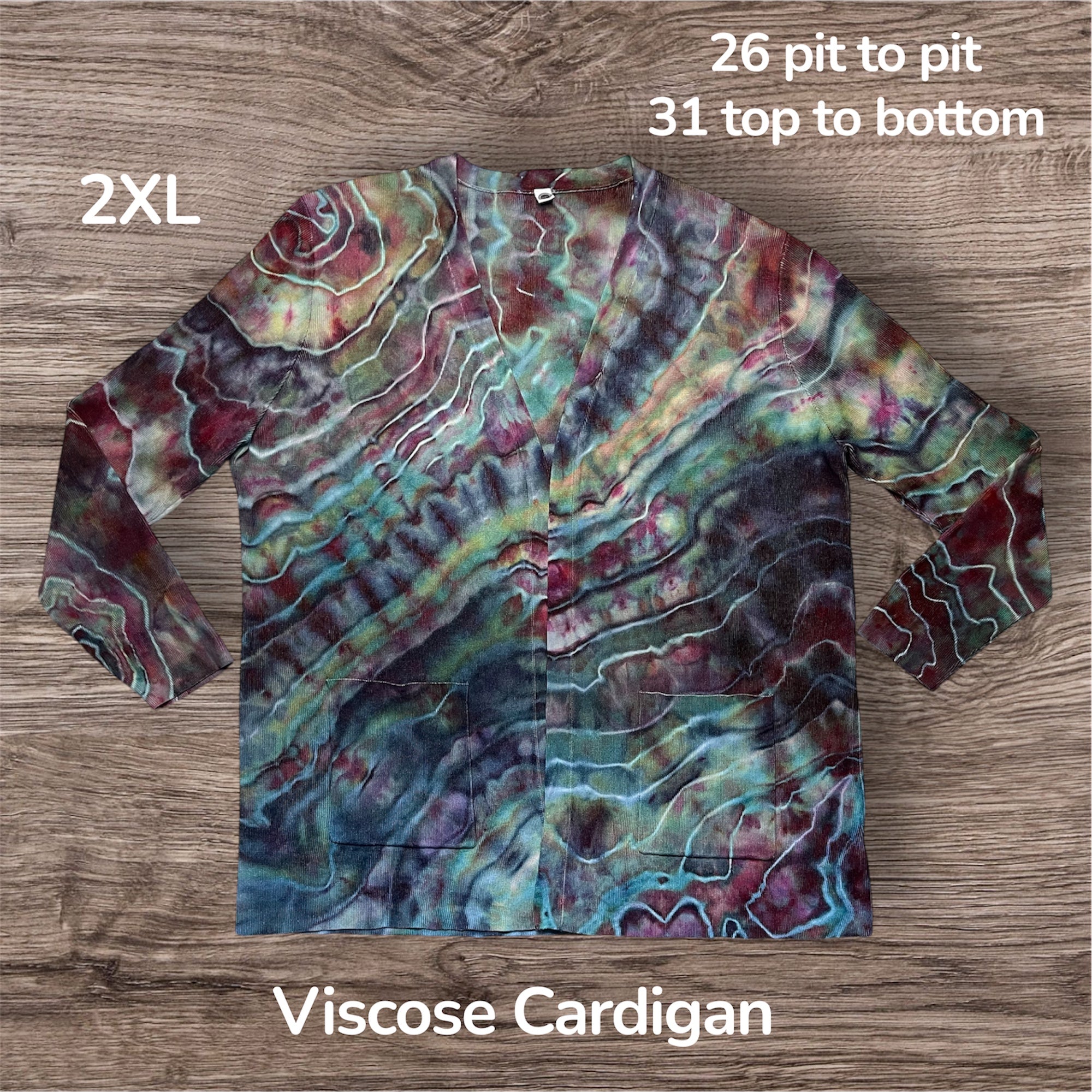 Hand tied and hand dyed, 100% viscose, open front cardigan with pockets. This one measures 26 inches pit to pit and 31 inches from top to bottom.