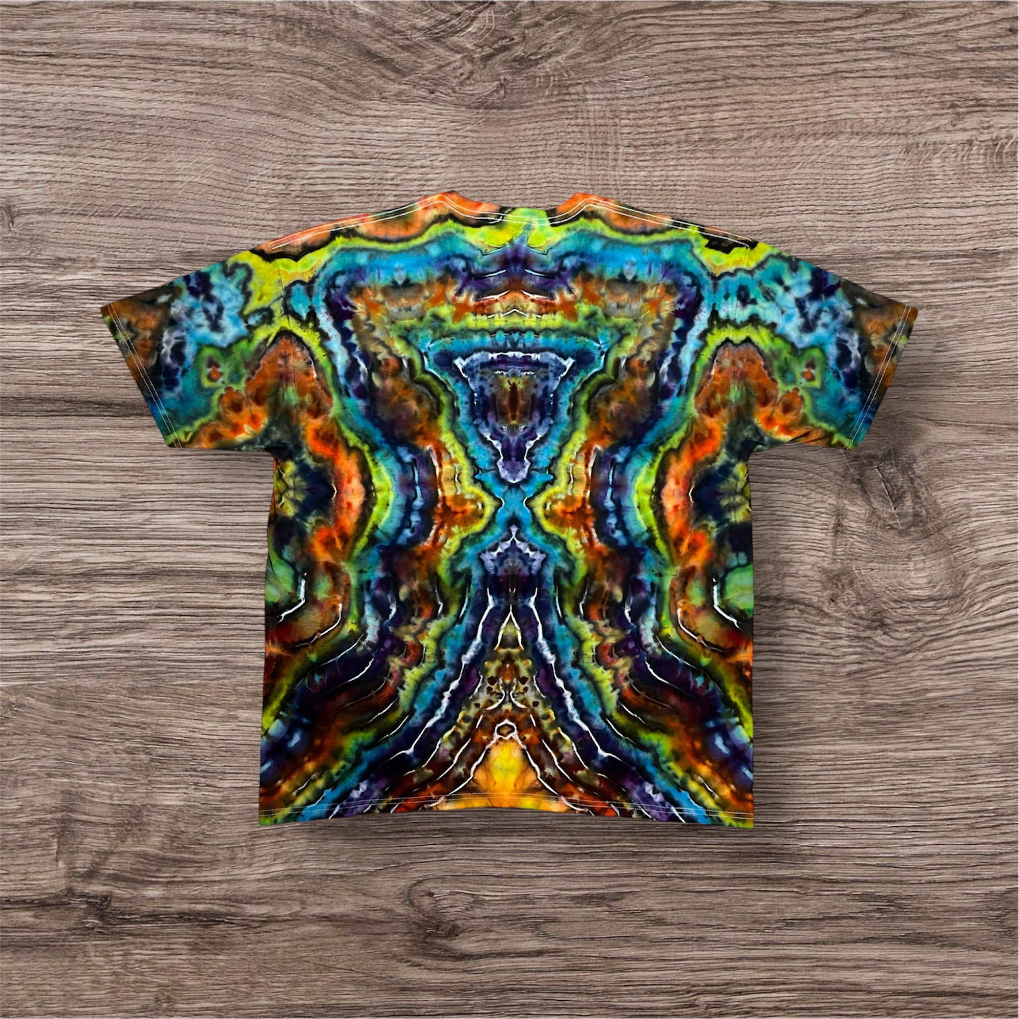 Hand tied and then hand ice dyed design on a Unisex, 100% cotton, Tultex 290  Tshirt. This one measures 27 inches pit to pit and 31 inches from top to bottom