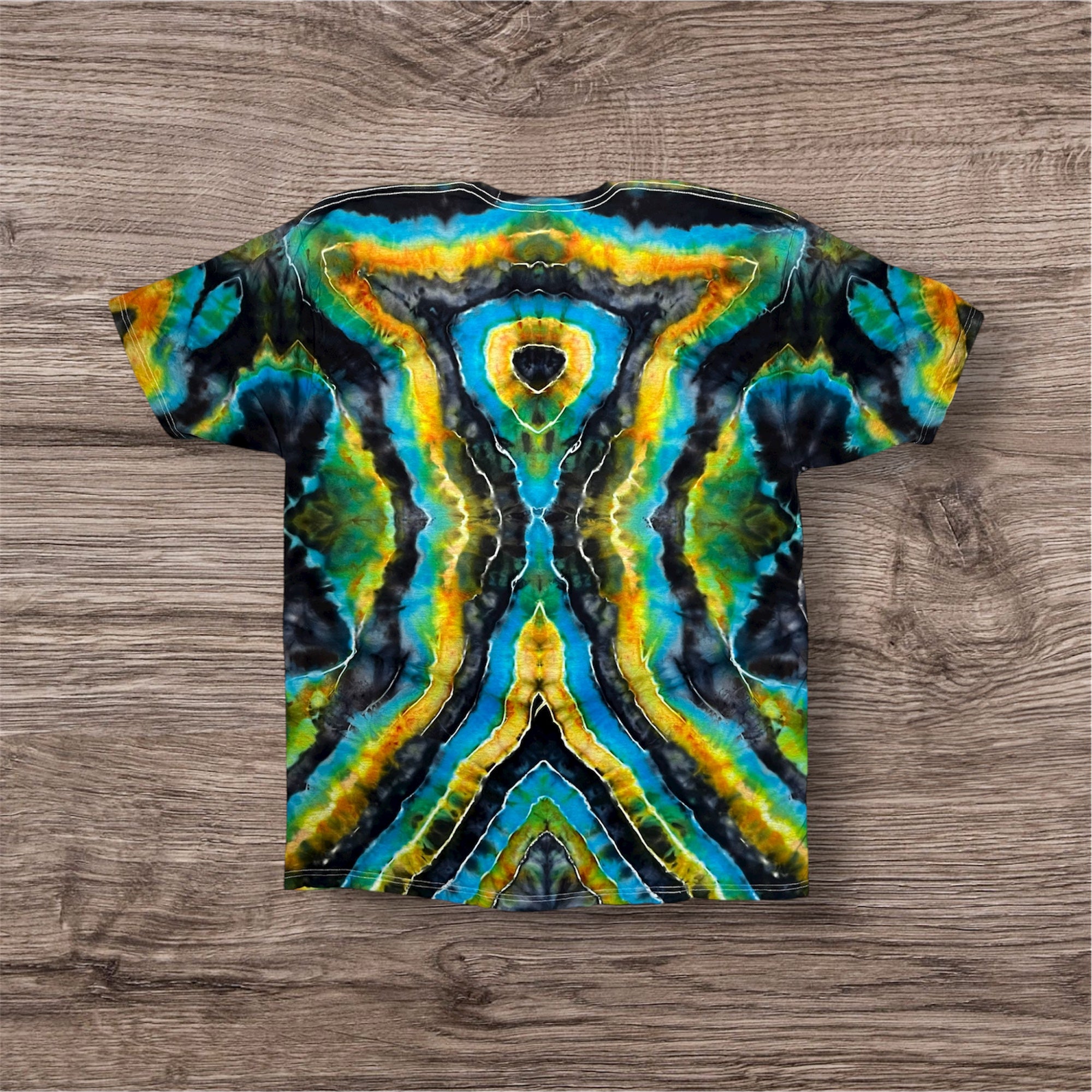 Hand tied and hand ice dyed mandala design on a unisex, 100% cotton, Tultex 290 Tshirt. This one measures 27 inches pit to pit and 29 inches from top of shoulder to bottom.