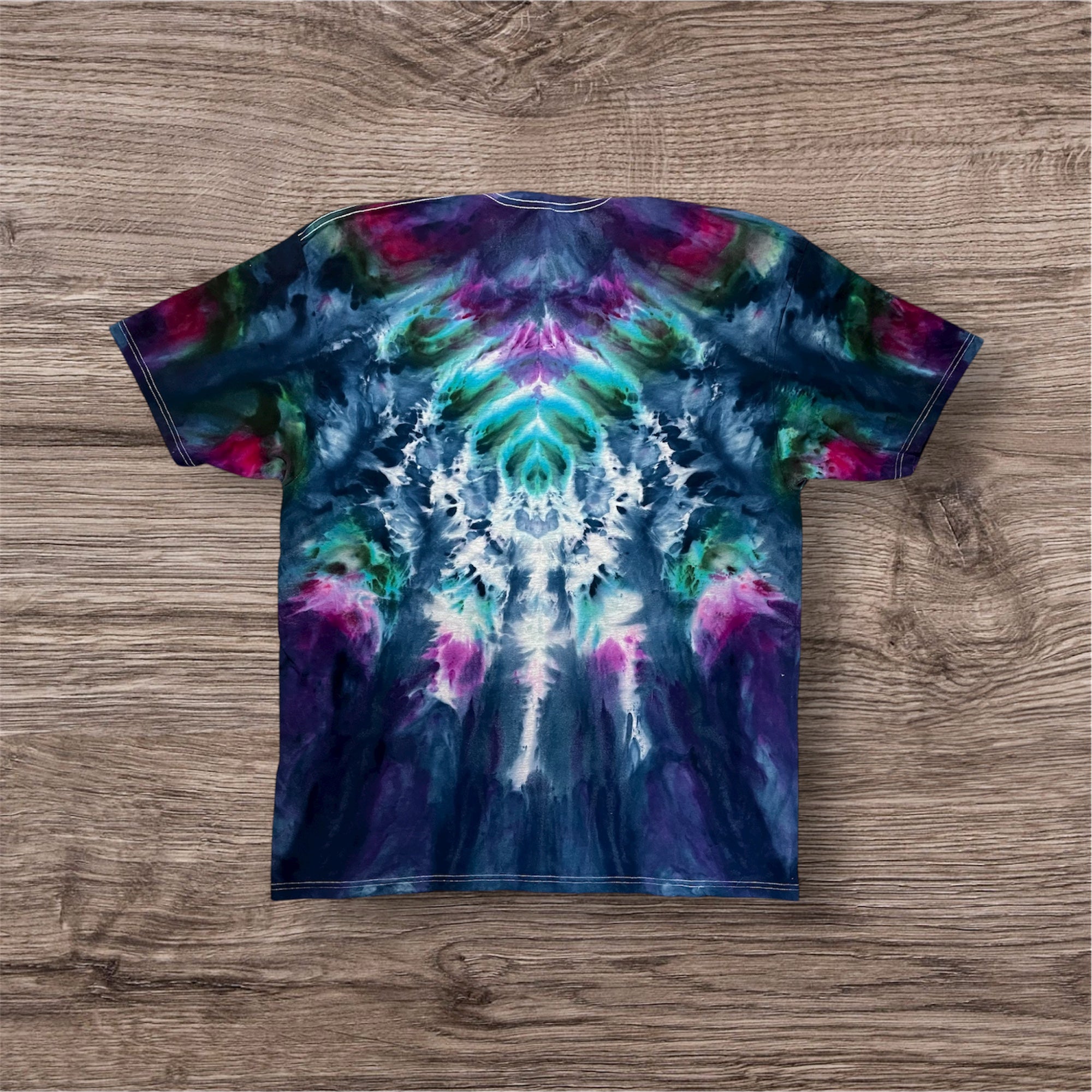 Hand tied and hand ice dyed design on a unisex, 100% cotton, Tultex 290 Tshirt. This one measures 26 inches pit to pit and 35 inches from top of shoulder to bottom.