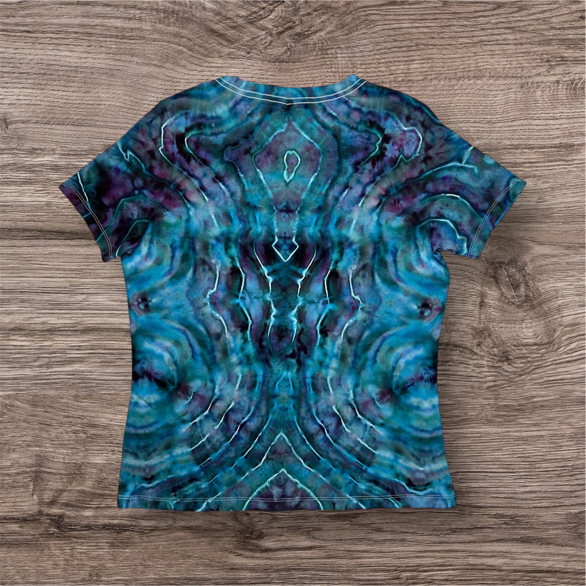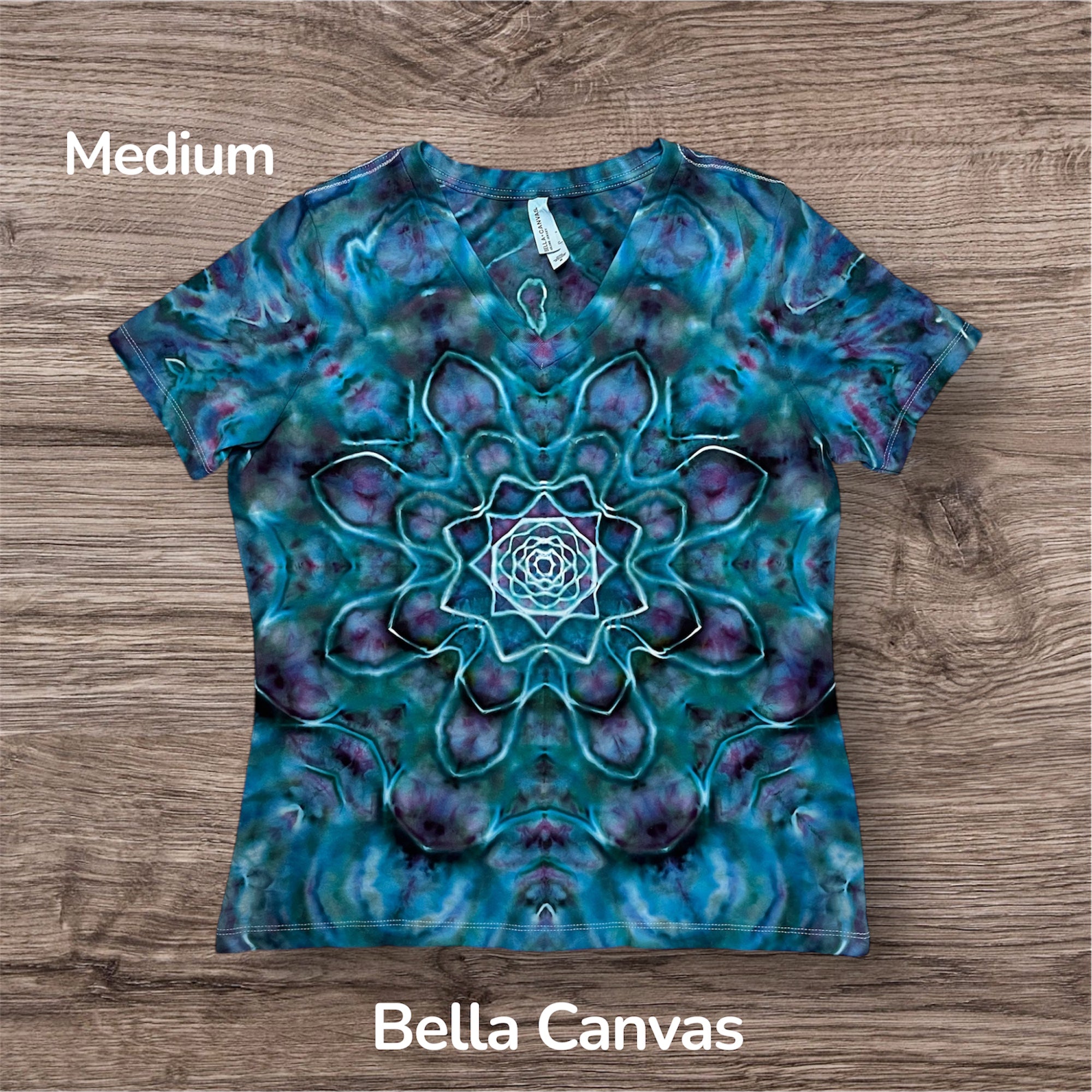 Hand tied and hand ice dyed design on a ladies, 100% cotton, Bella Canvas Tshirt. This one measures 20 inches pit to pit and 25 inches from top to bottom.