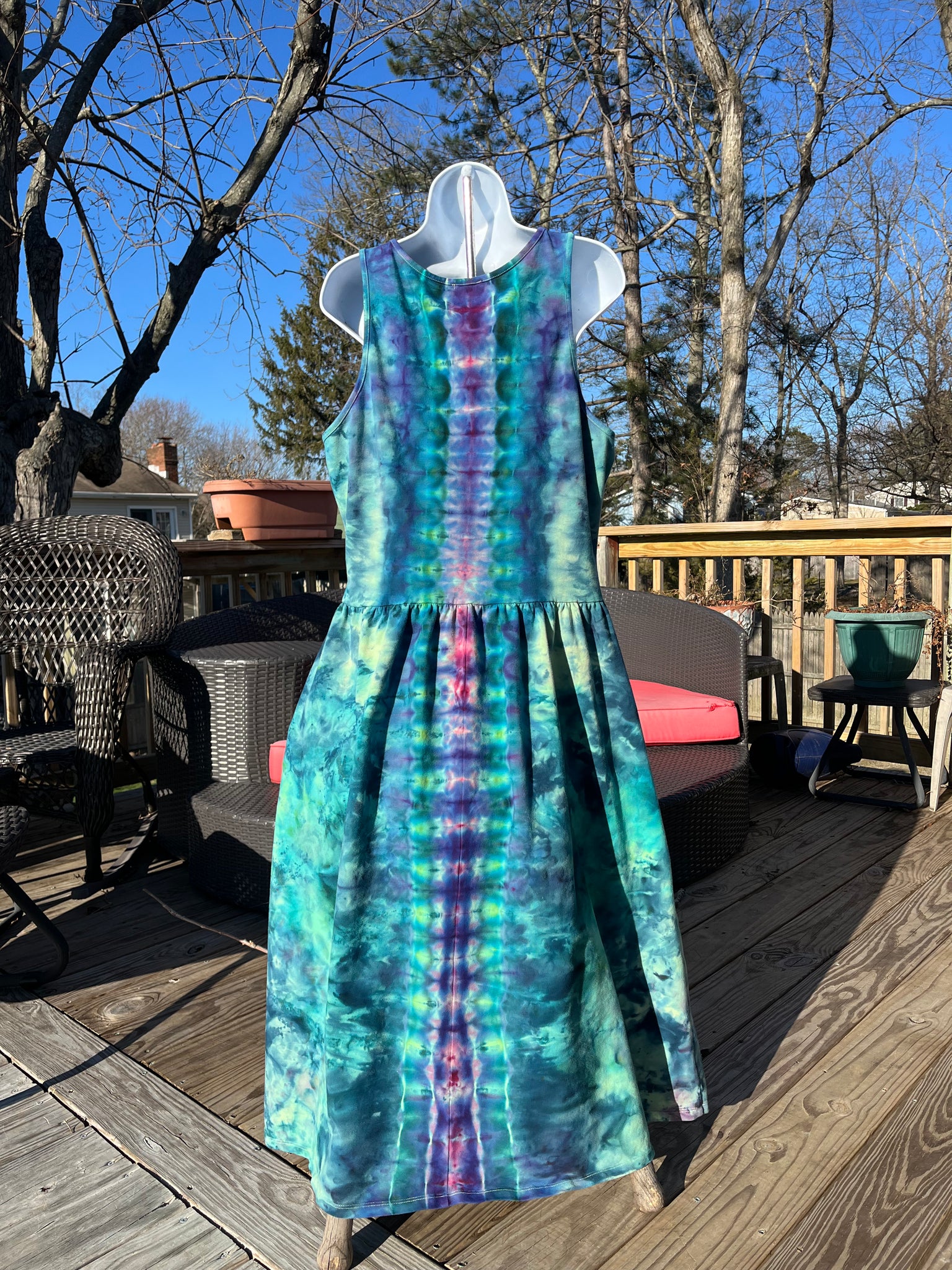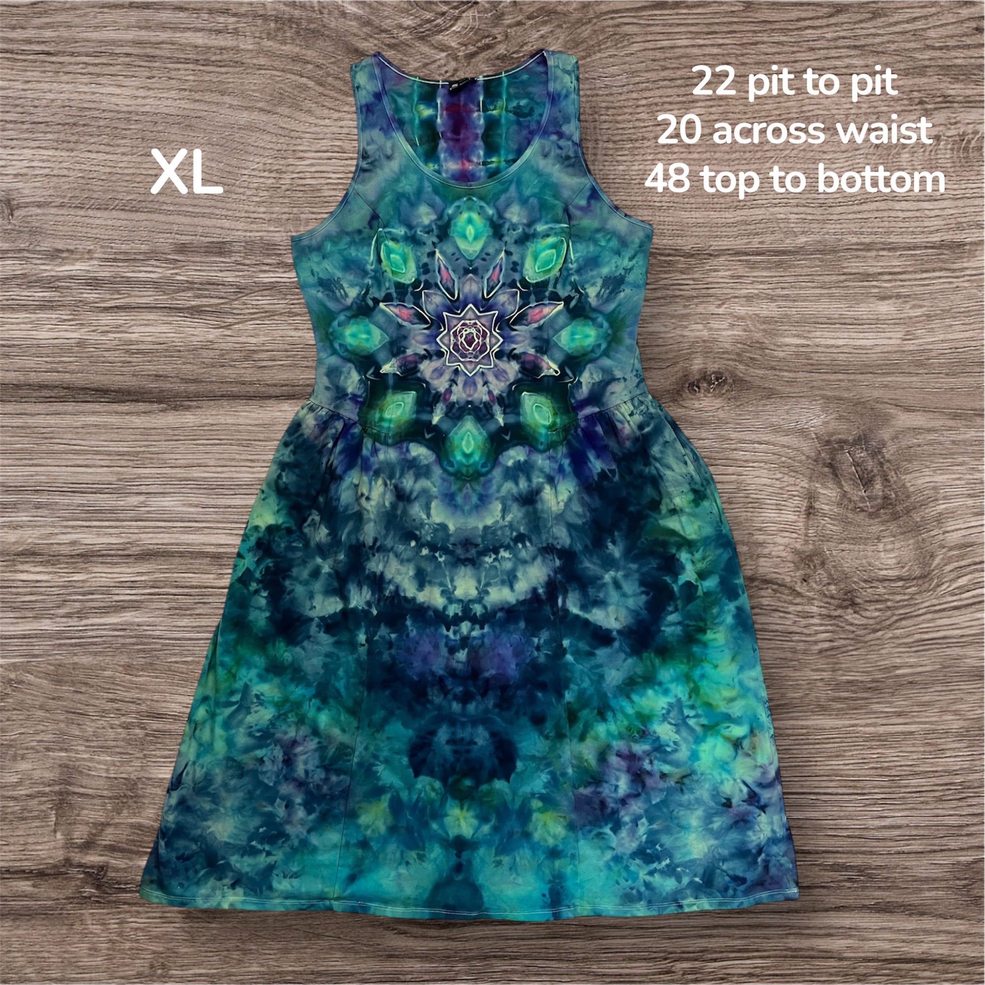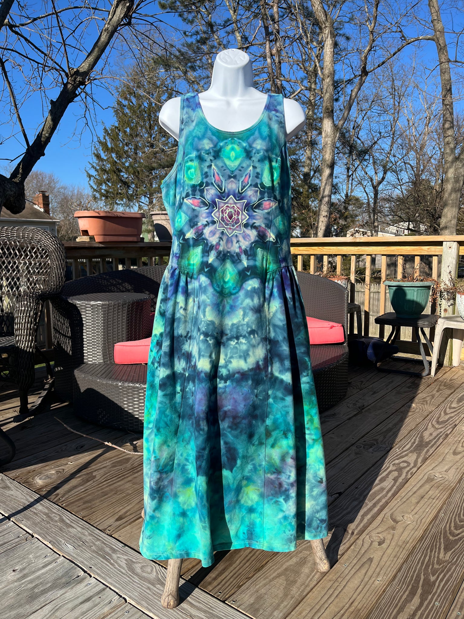 Hand tied,then hand ice dyed mandala design on a Ladies cotton, sleeveless, pocketed, dress. This one measures 22 inches pit to pit and 20 at the waist 48 in. from top of shoulder to bottom.