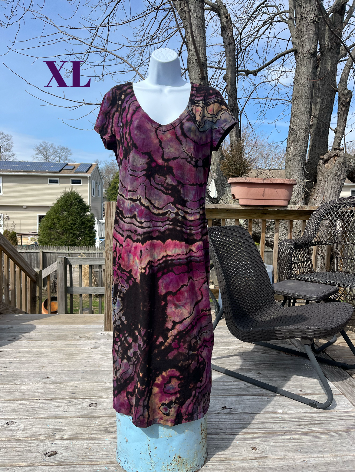 Hand tied,reverse dyed then hand ice dyed geode design on a Ladies cotton:modal blend dress. This one measures inches pit to pit, 18 across the waist and 46 in. from top of shoulder to bottom.