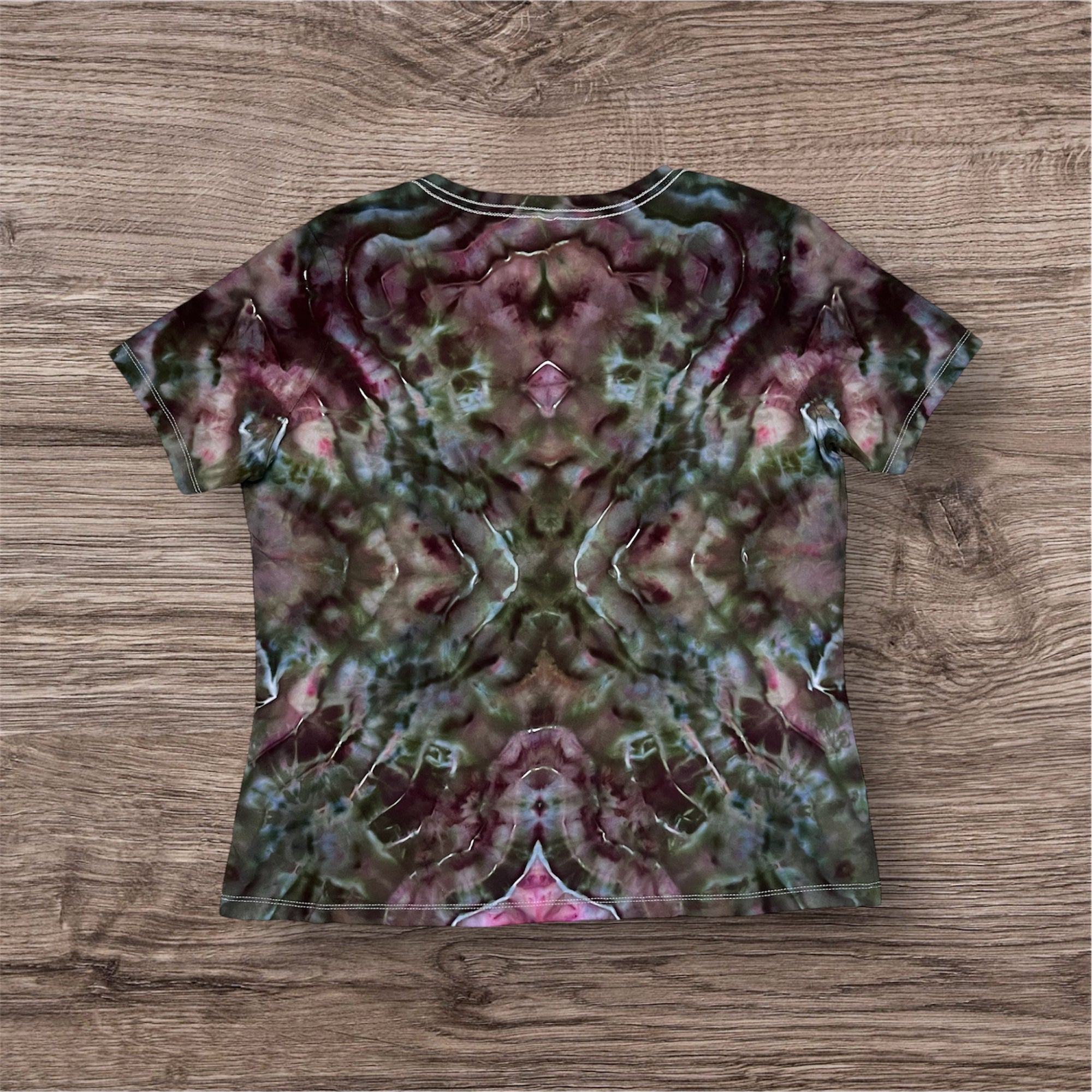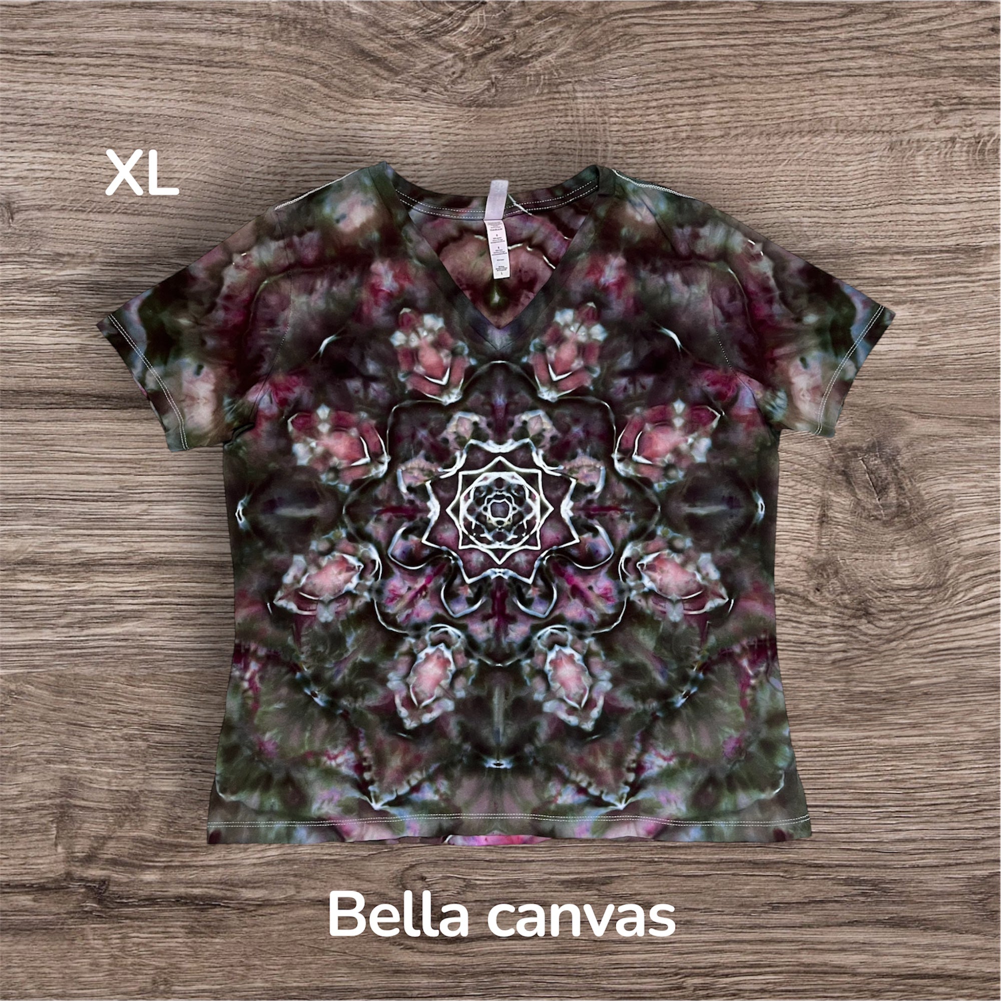Hand tied and hand ice dyed design on a ladies, 100% cotton, Bella Canvas Tshirt. This one measures 22 inches pit to pit and 26 inches from top to bottom.
