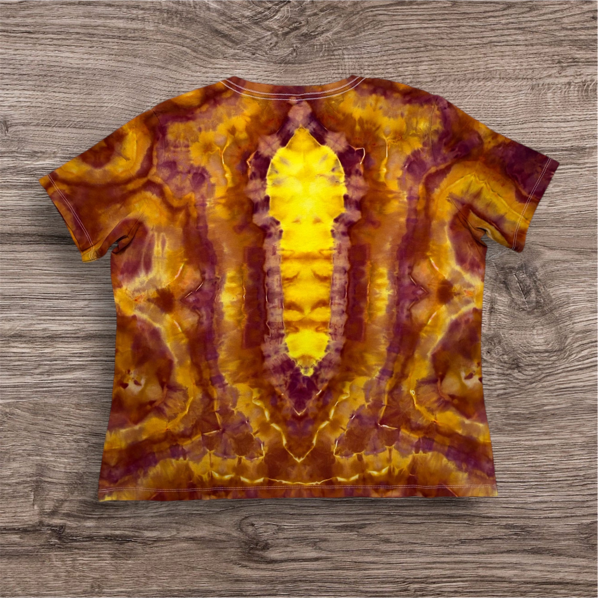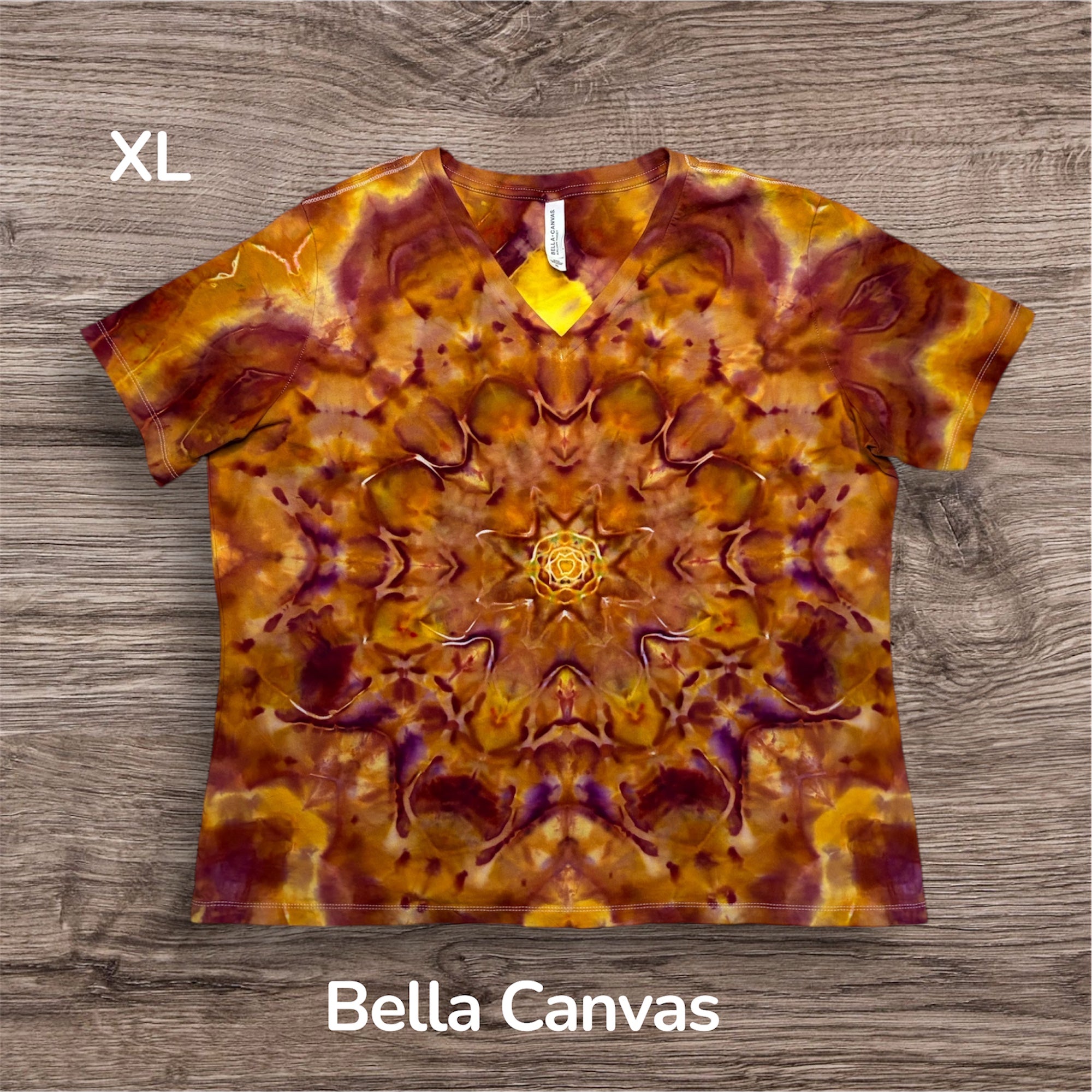 Hand tied and hand ice dyed design on a ladies, 100% cotton, Bella Canvas Tshirt. This one measures 22 inches pit to pit and 26 inches from top to bottom.