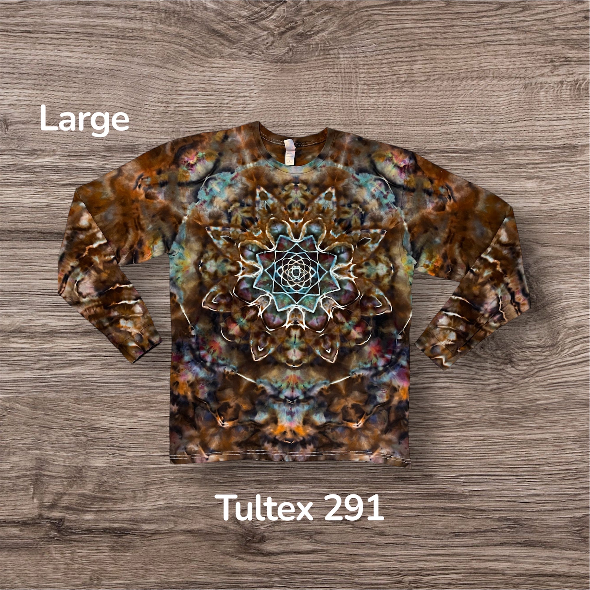 Hand tied, and hand ice dyed mandala design on a unisex, 100% cotton, Tultex 291 long sleeve Tshirt. This one measures 23 inches pit to pit and 30 inches from top of shoulder to bottom.