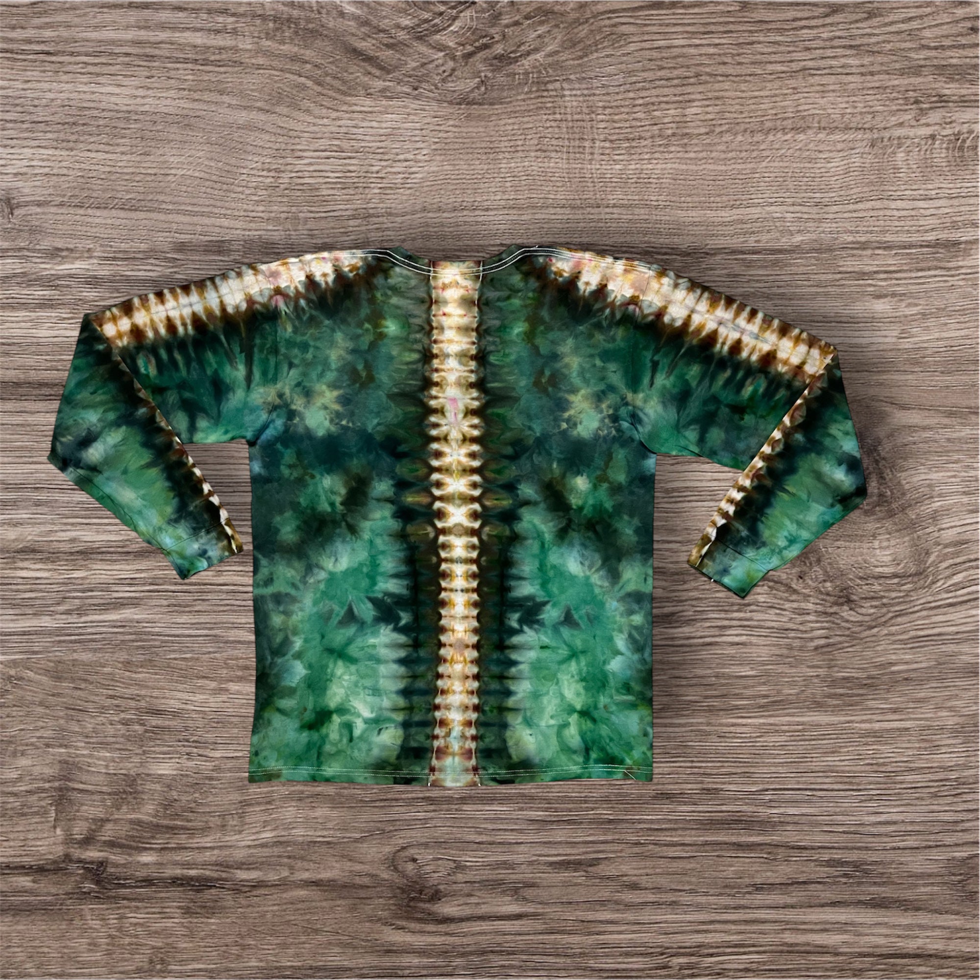Hand tied, and hand ice dyed design on a unisex, 100% cotton, Tultex 291 long sleeve Tshirt. This one measures 23 inches pit to pit and 30 inches from top of shoulder to bottom.