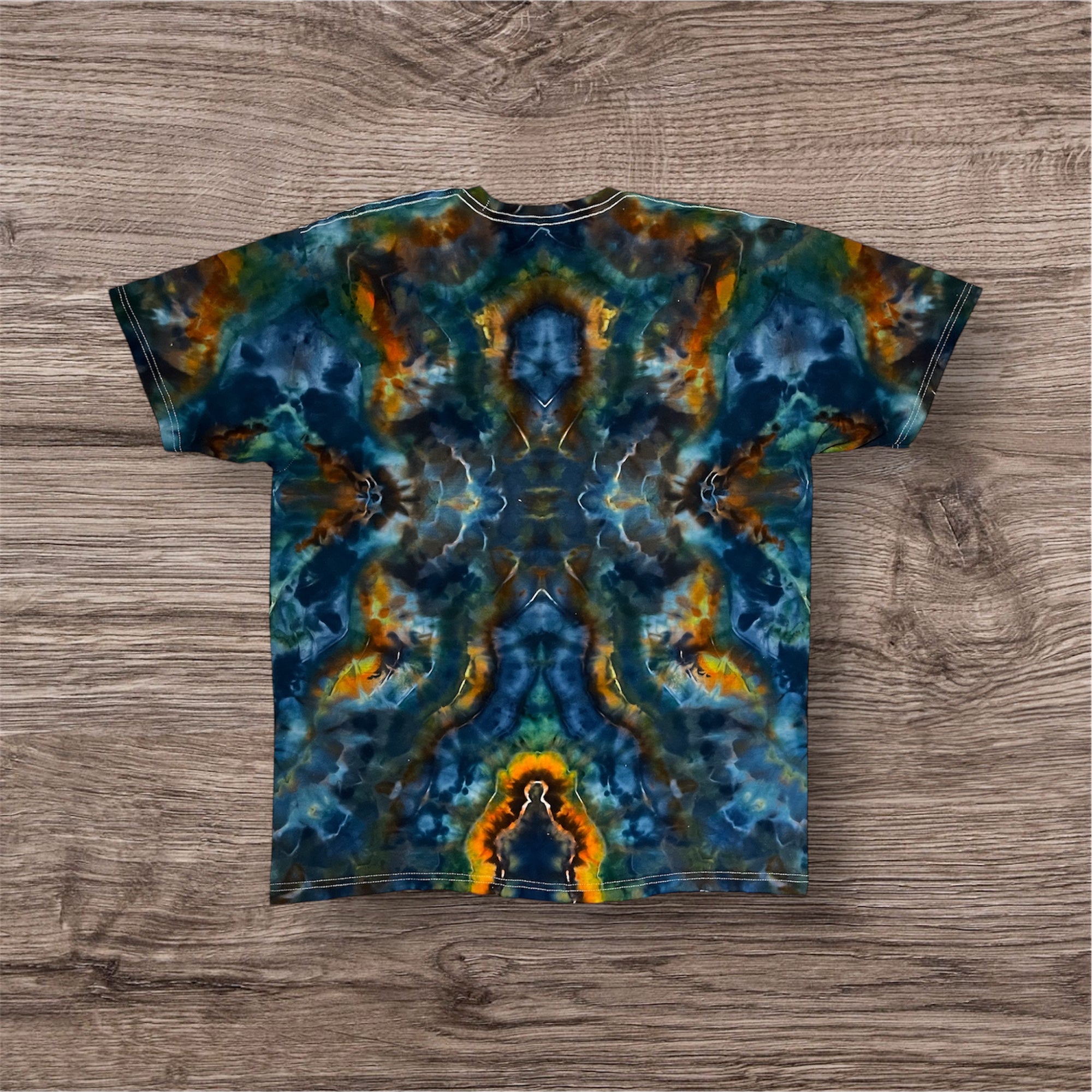 Hand tied, and hand ice dyed design on a unisex, 100% cotton, Tultex 290 Tshirt. This one measures 23 inches pit to pit and 30 inches from top of shoulder to bottom.