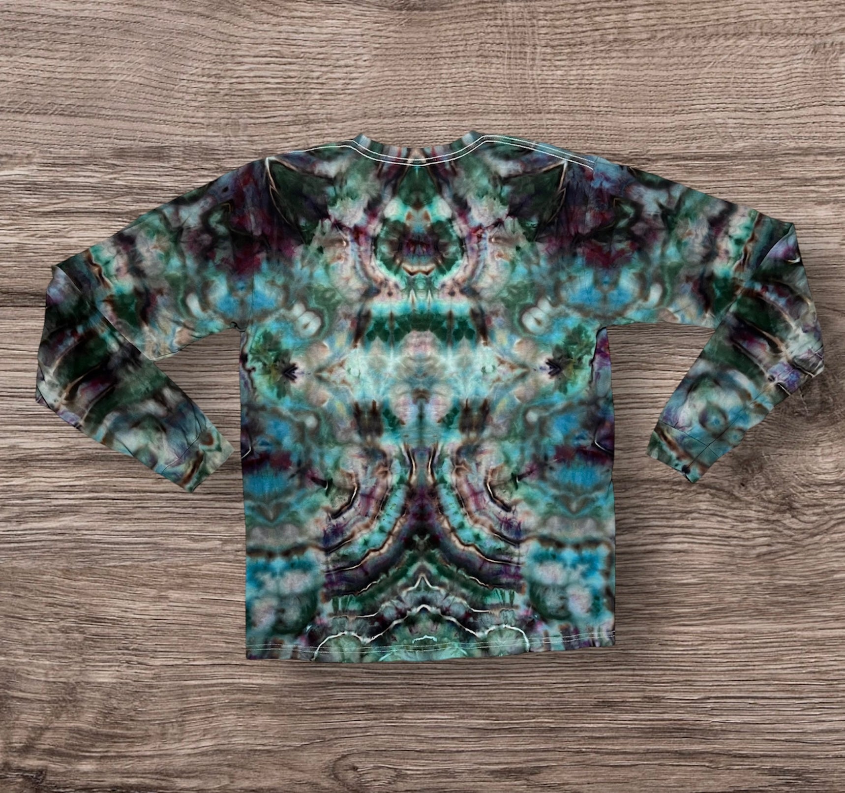 Hand tied and then hand ice dyed mandala design on a long sleeve Unisex, 100% cotton, Tultex 291 Tshirt. This one measures 20 inches pit to pit and 29 inches from top to bottom