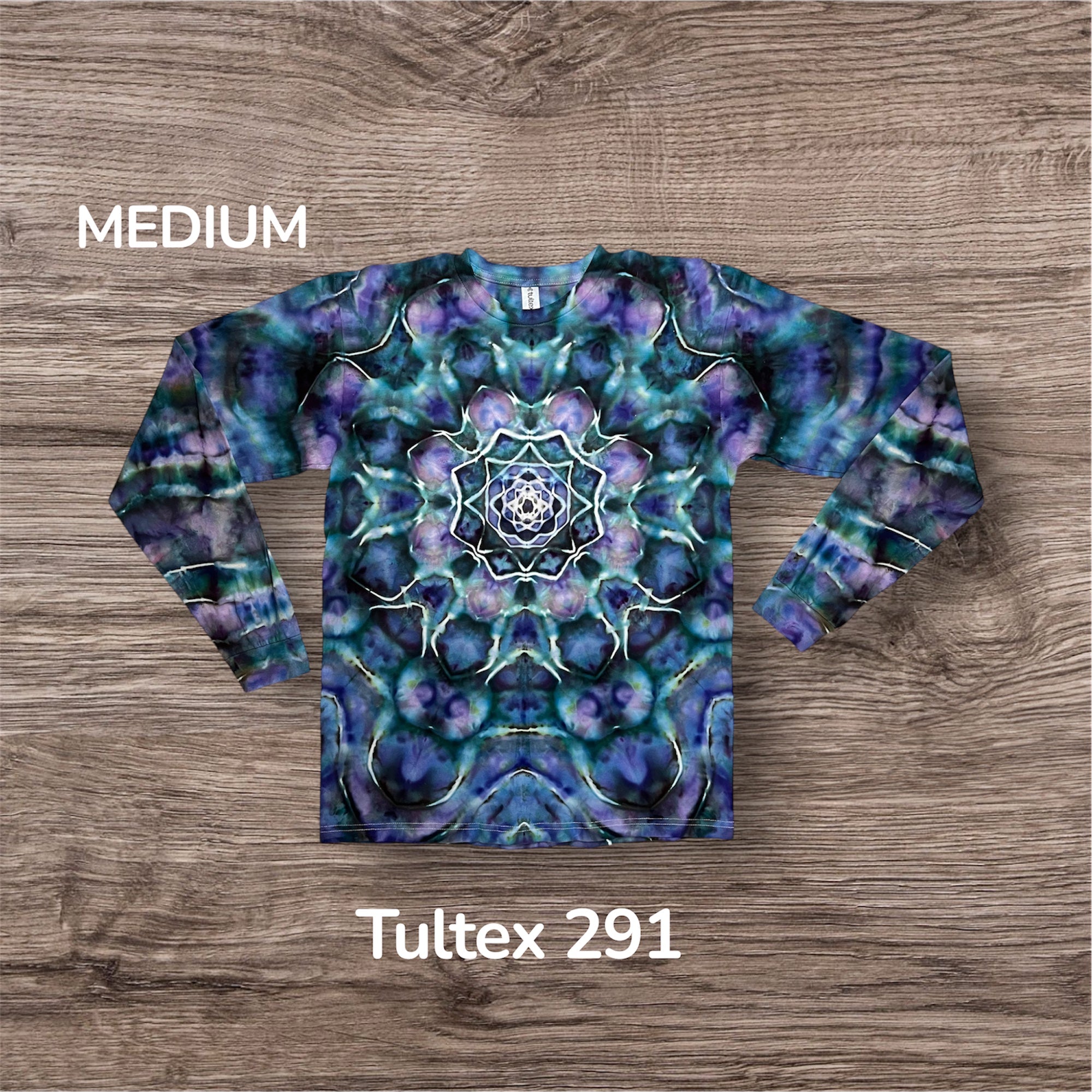 Hand tied and then hand ice dyed mandala design on a long sleeve Unisex, 100% cotton, Tultex 291 Tshirt. This one measures 20 inches pit to pit and 29 inches from top to bottom
