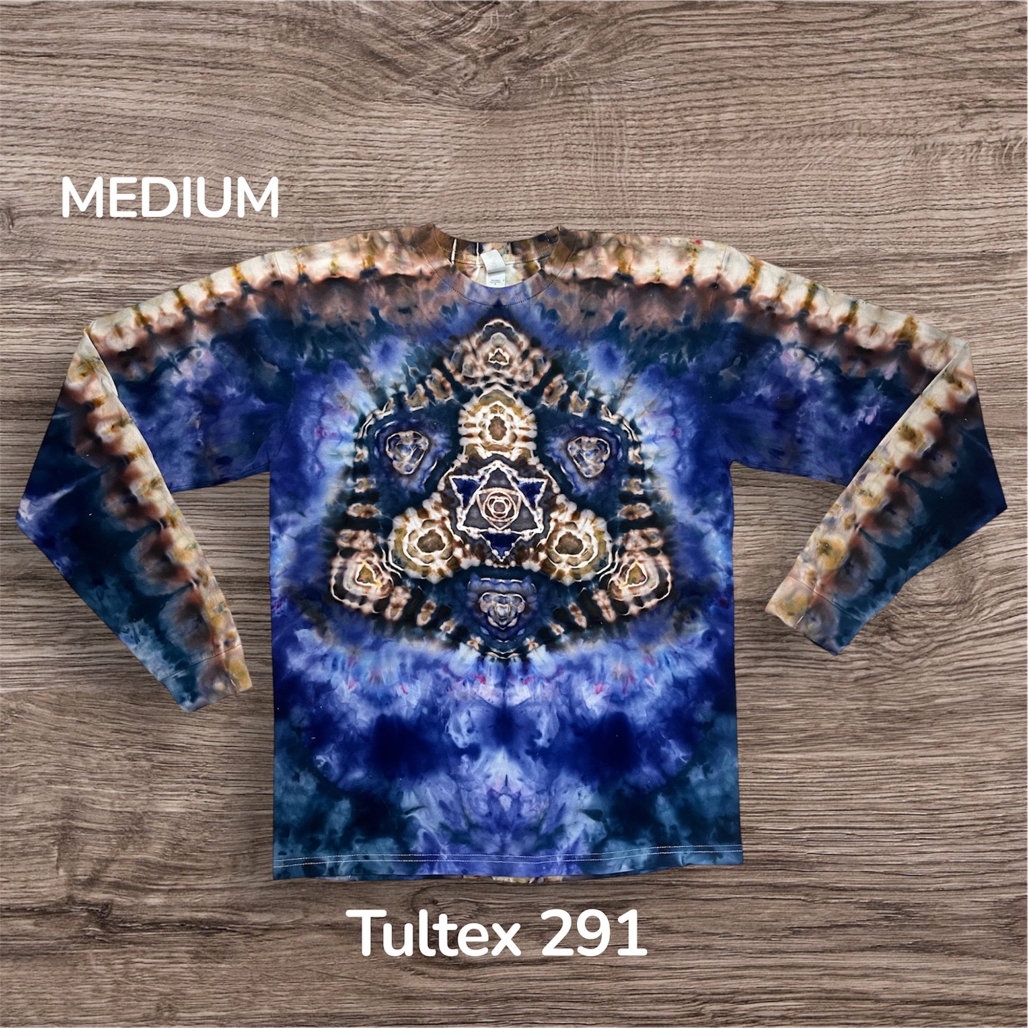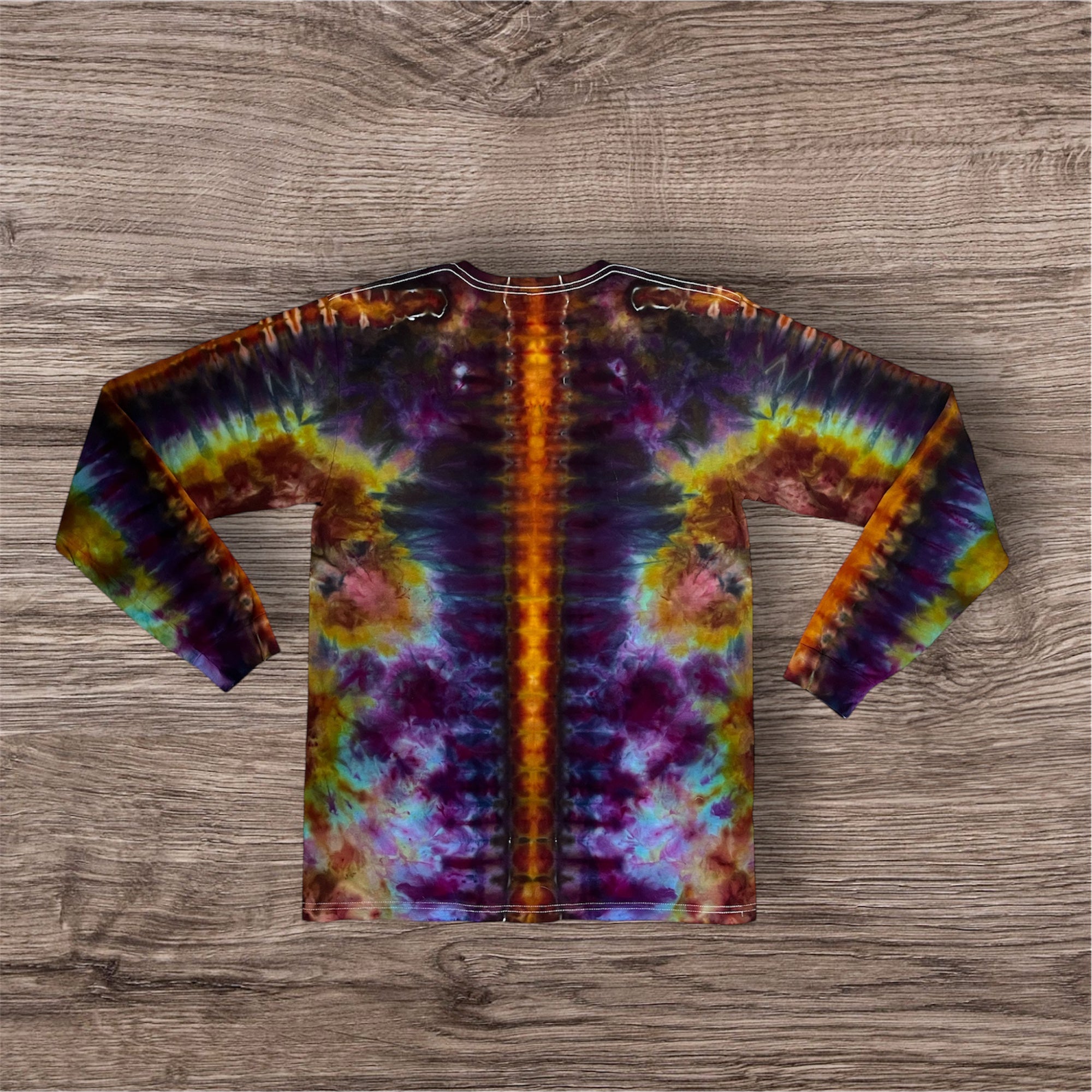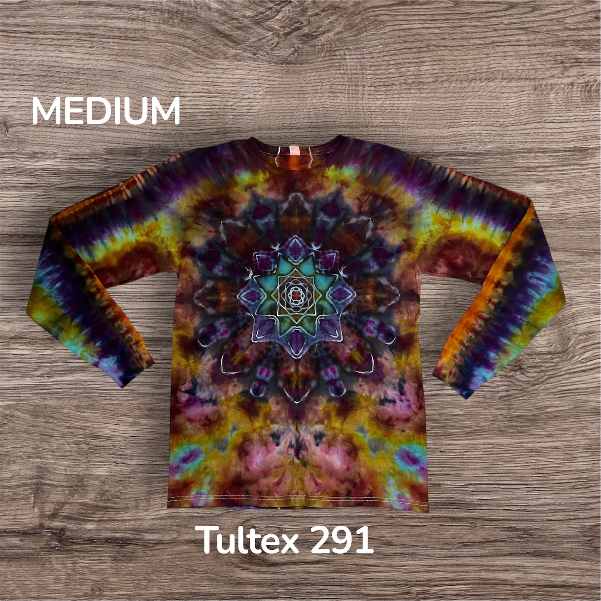 Hand tied and then hand ice dyed mandala design on a long sleeve Unisex, 100% cotton, Tultex 291 Tshirt. This one measures 20 inches pit to pit and 29 inches from top to bottom