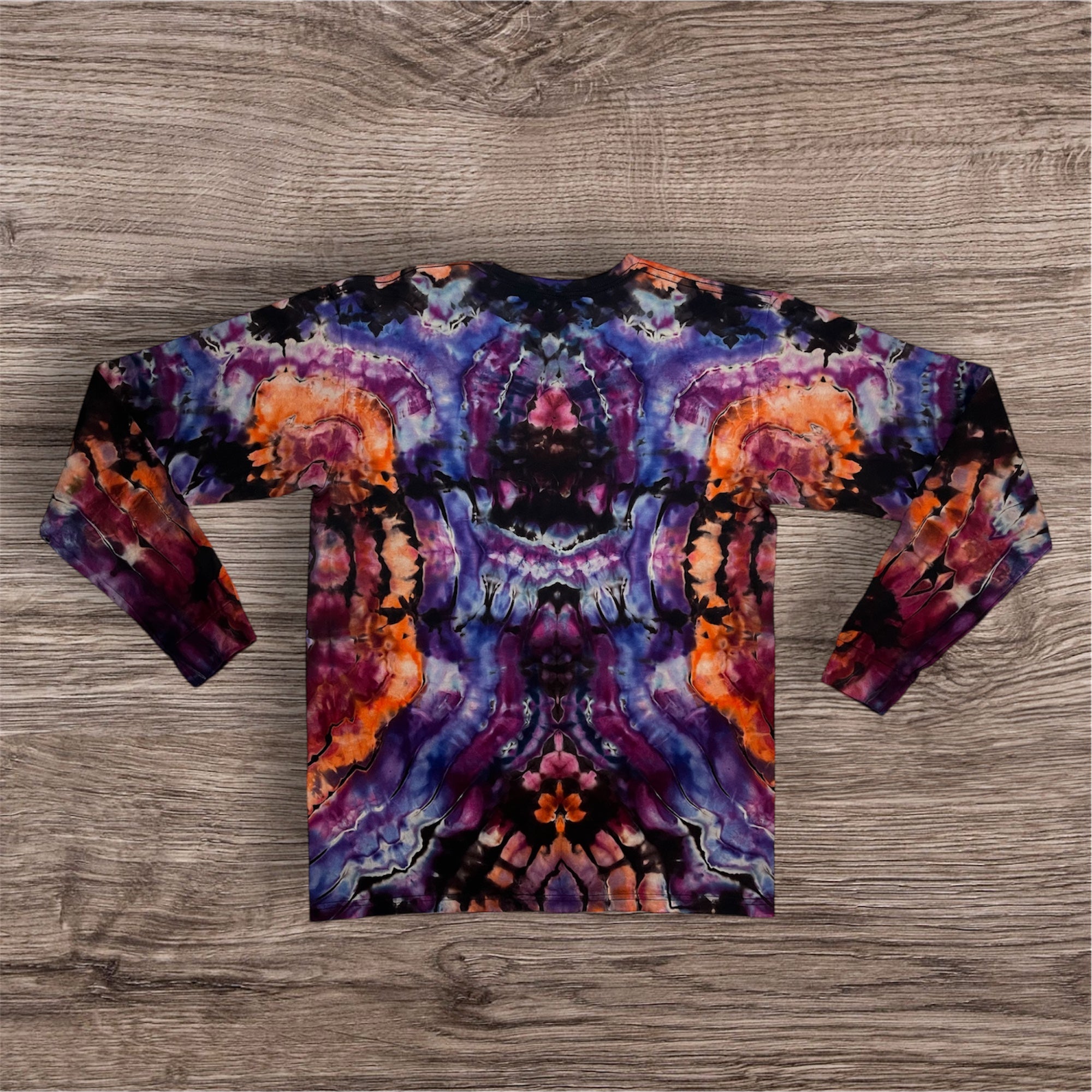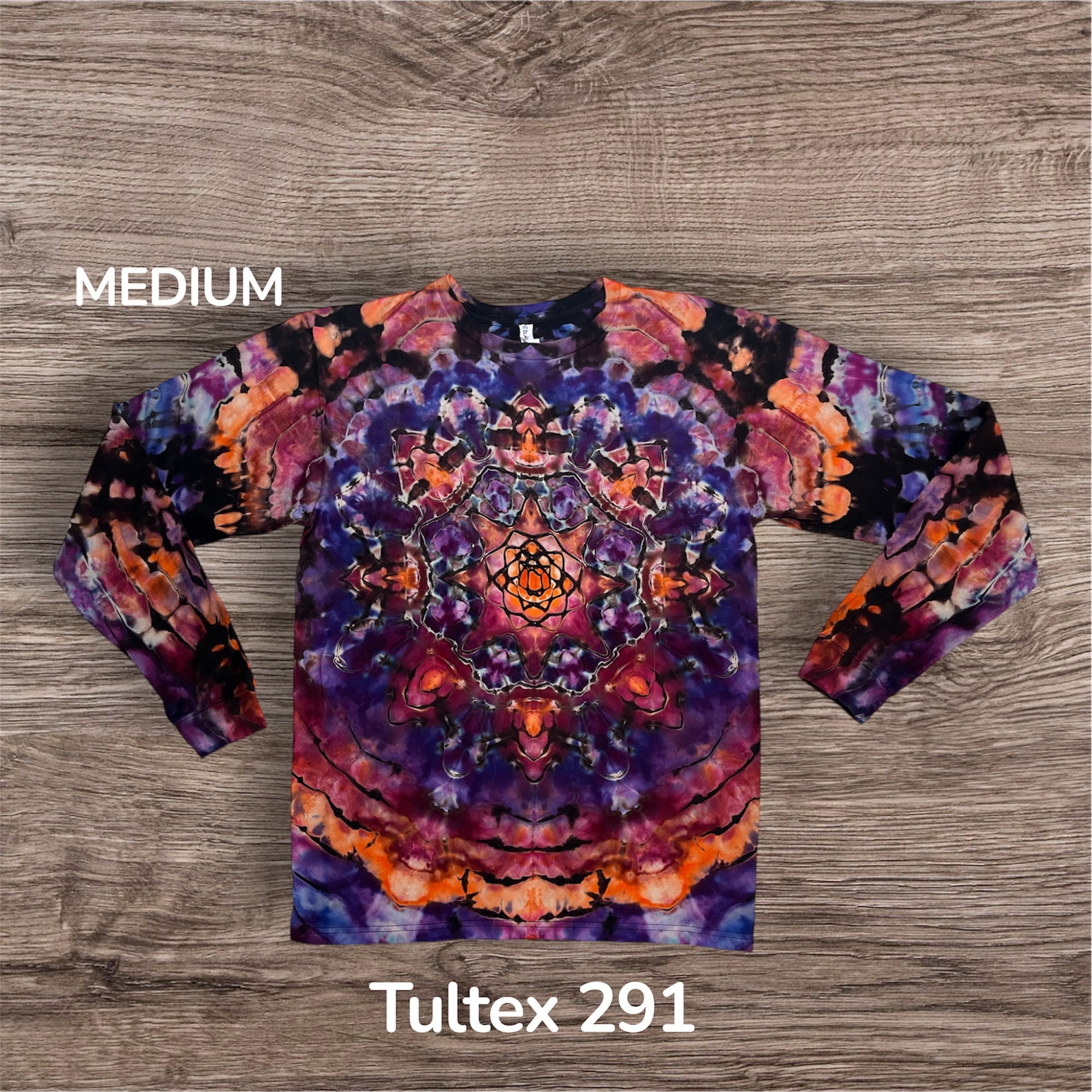 Hand tied and then hand ice dye mandala design on a long sleeve Unisex, 100% cotton, Tultex 291 Tshirt. This one measures 20 inches pit to pit and 29 inches from top to bottom