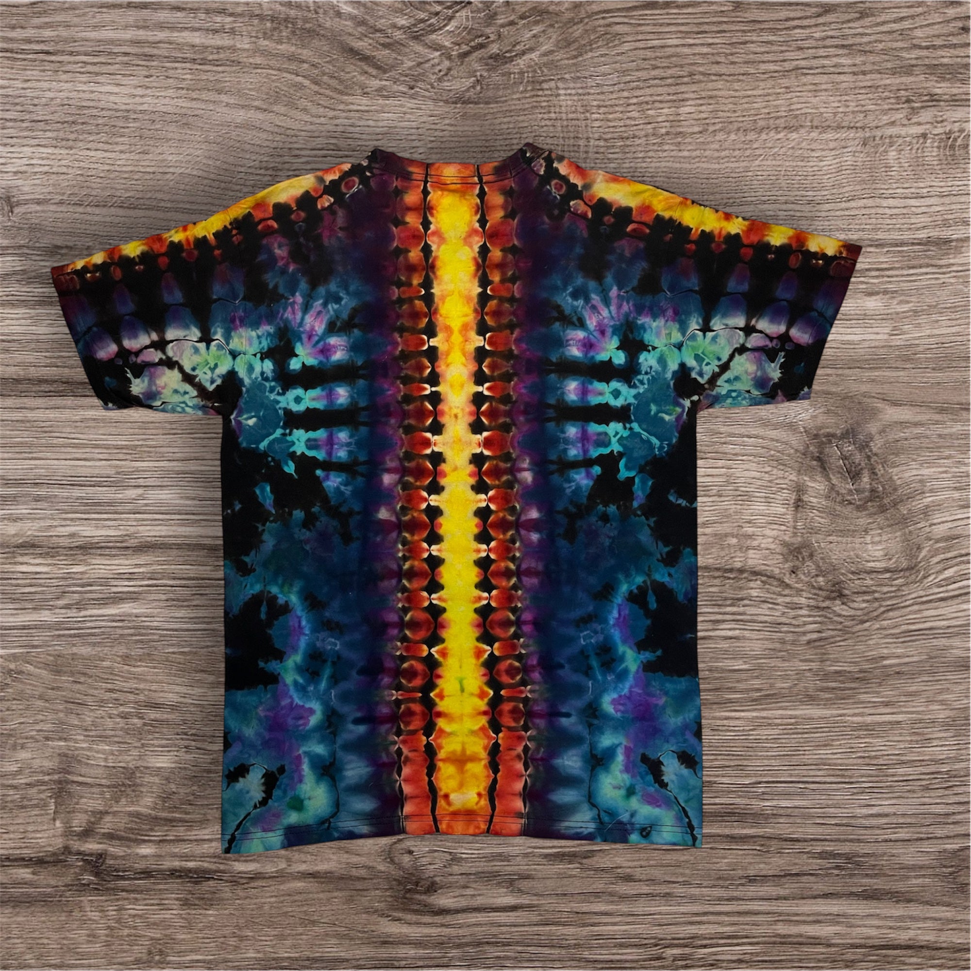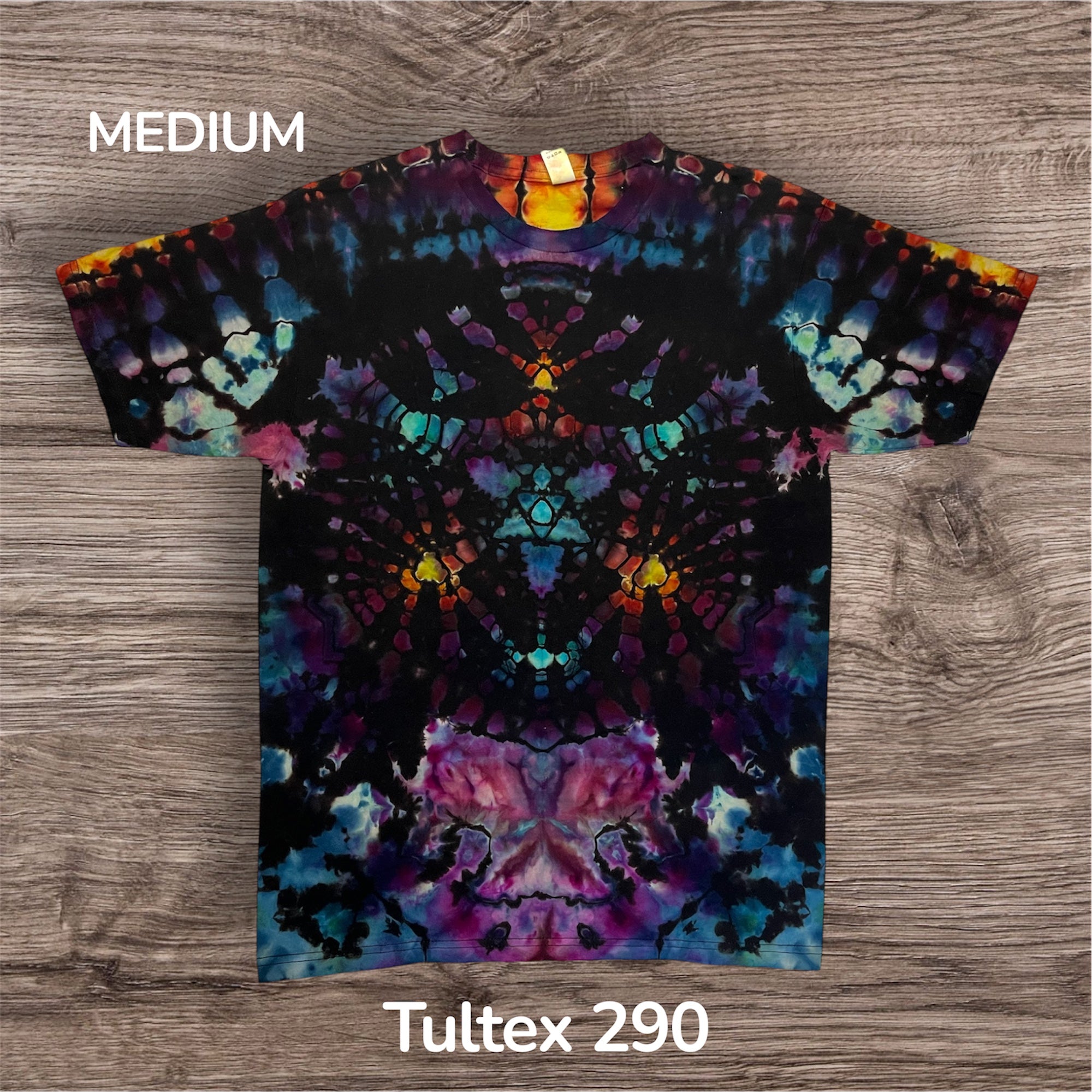 Hand tied, reverse dyed and then hand ice dye mandala design on a Unisex, 100% cotton, Tultex 291 Tshirt. This one measures 20 inches pit to pit and 29 inches from top to bottom