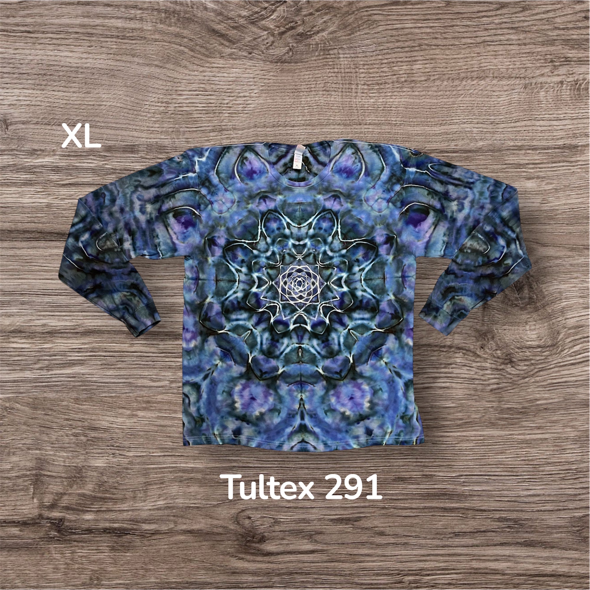 Hand tied and then hand ice dyed design on a Unisex, 100% cotton, Tultex 291 long sleeve Tshirt. This one measures 25 inches pit to pit and 32 inches from top to bottom