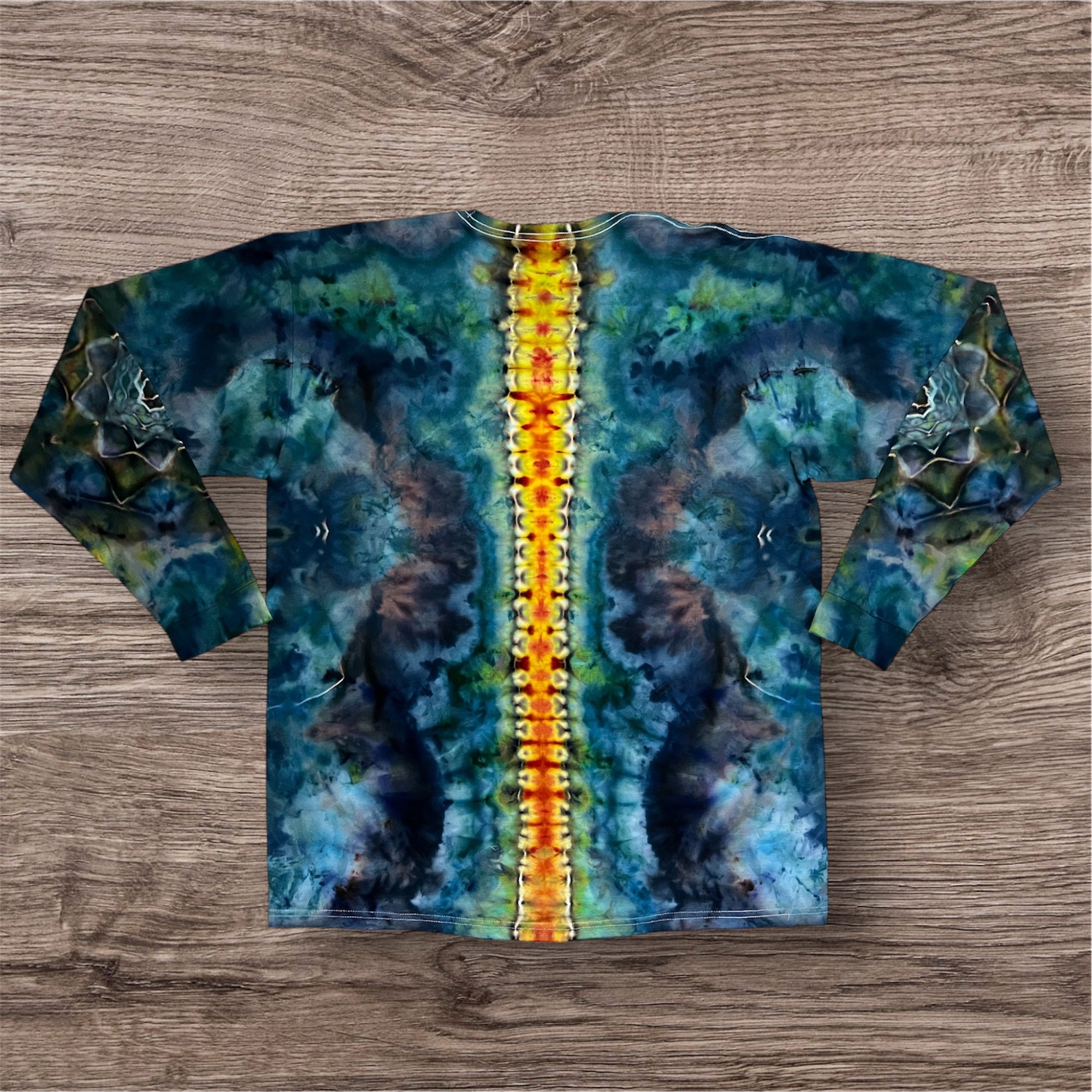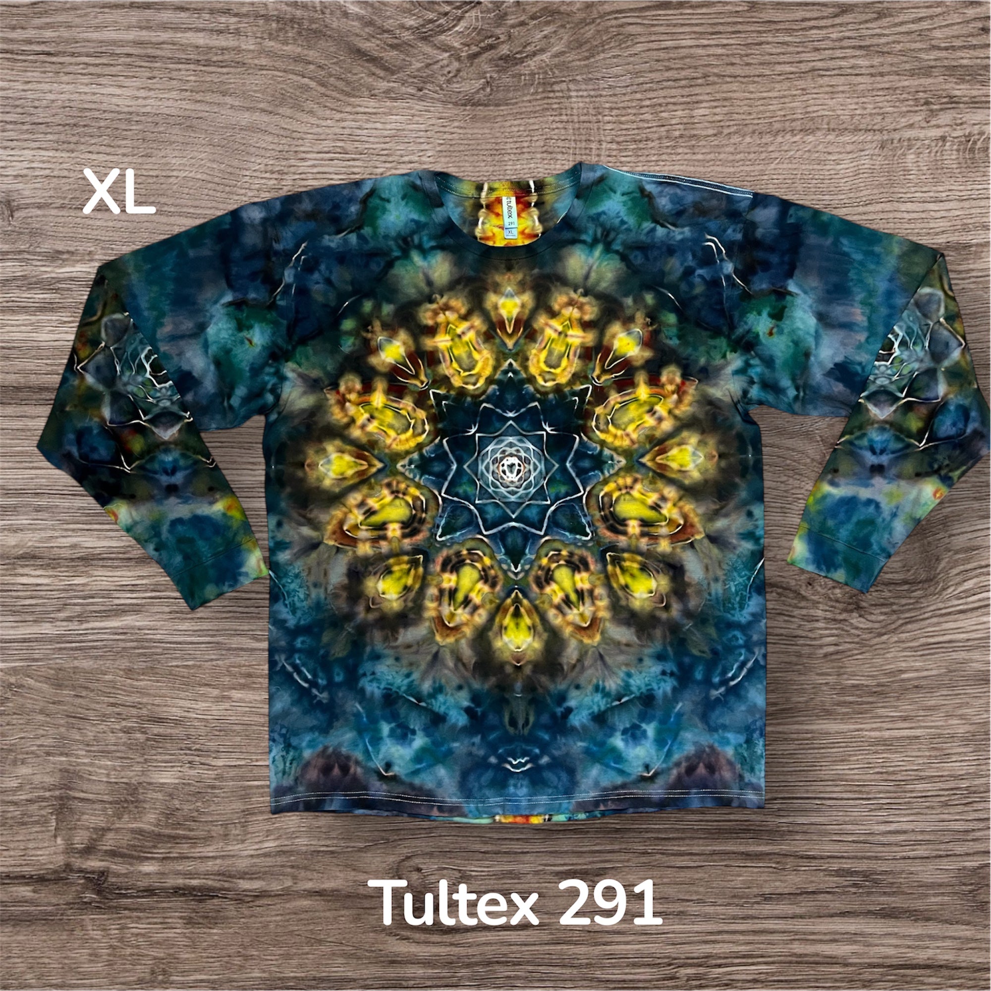 Hand tied and then hand ice dyed mandala design on a Unisex, 100% cotton, Tultex 291 long sleeve Tshirt. This one measures 25 inches pit to pit and 32 inches from top to bottom