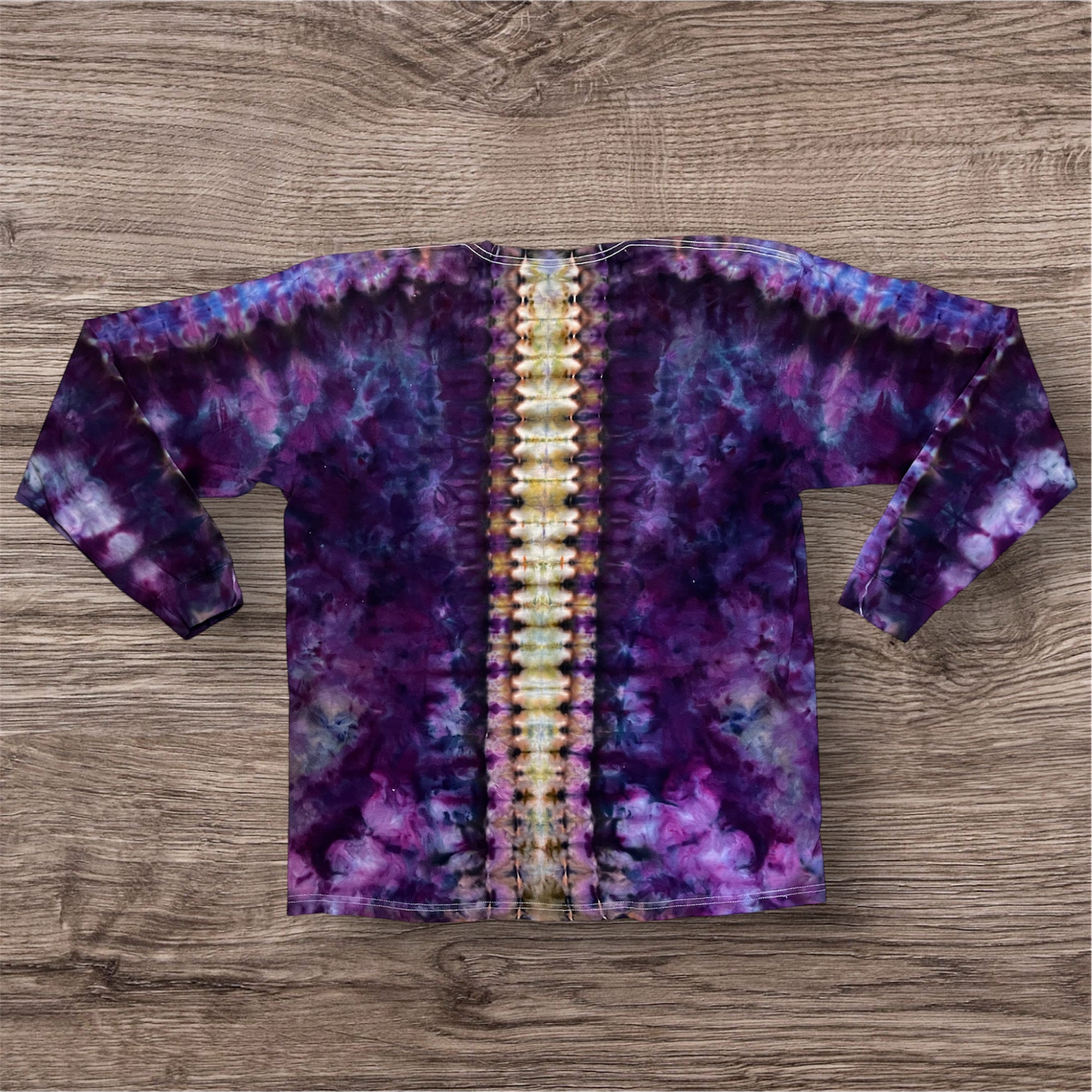 Hand tied and then hand ice dyed mandala design on a Unisex, 100% cotton, Tultex 291 long sleeve Tshirt. This one measures 25 inches pit to pit and 32 inches from top to bottom