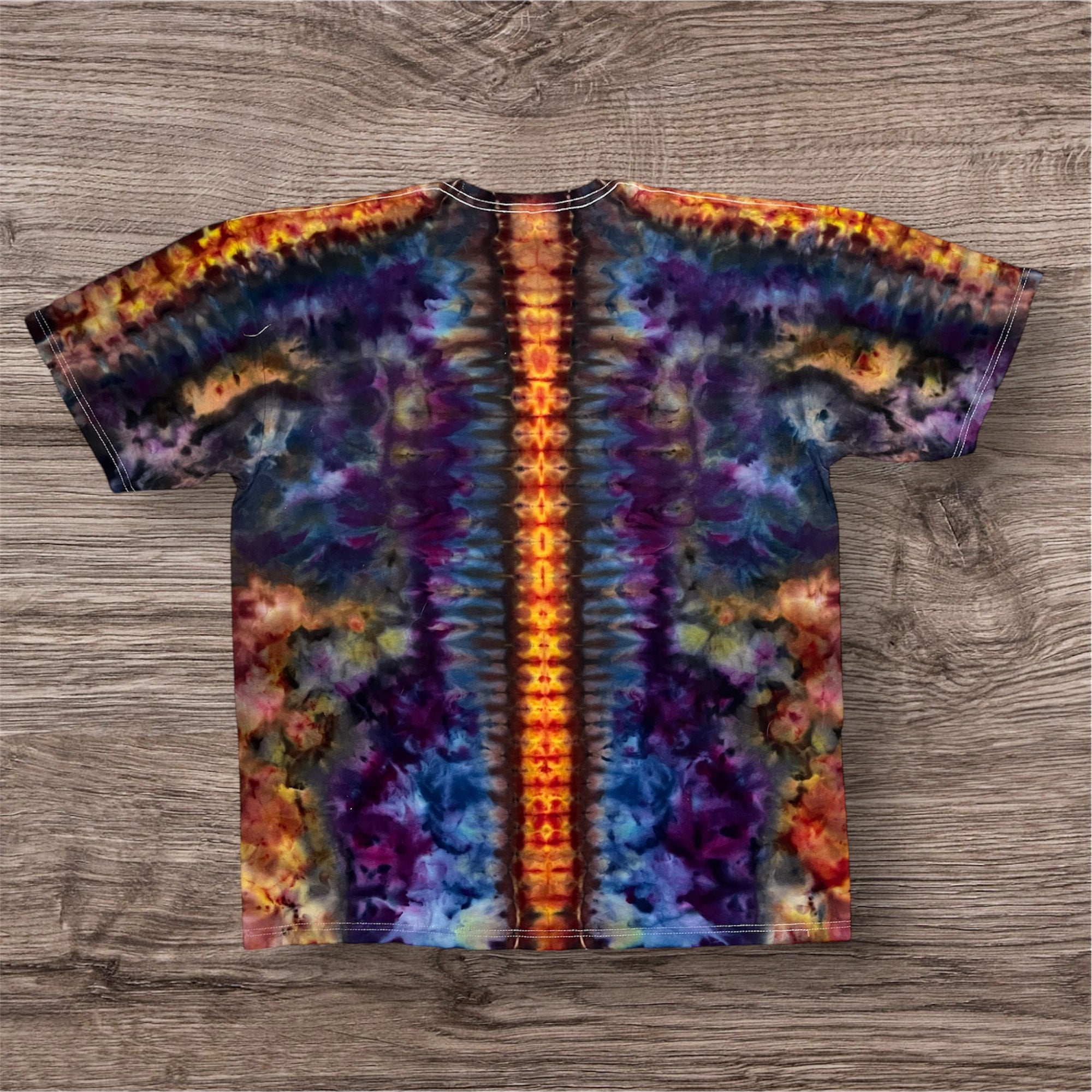 Hand tied and then hand ice dyed design on a Unisex, 100% cotton, Tultex 290 Tshirt. This one measures 25 inches pit to pit and 32 inches from top to bottom