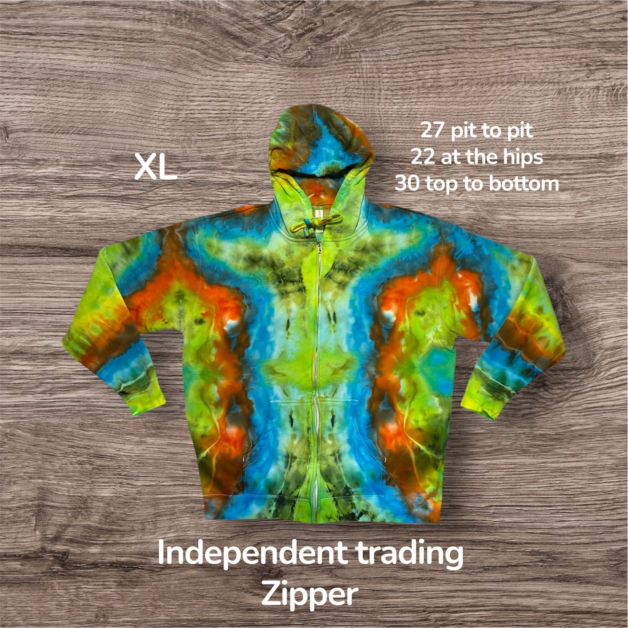 Hand tied and hand ice dyed mandala design on a Unisex independent trading, Midweight, zipper, hooded sweatshirt. These sweatshirts are 80/20 cotton/poly. This one measures 27 inches pit to pit , 22 at the hips and 30 inches from top of shoulder to bottom.
